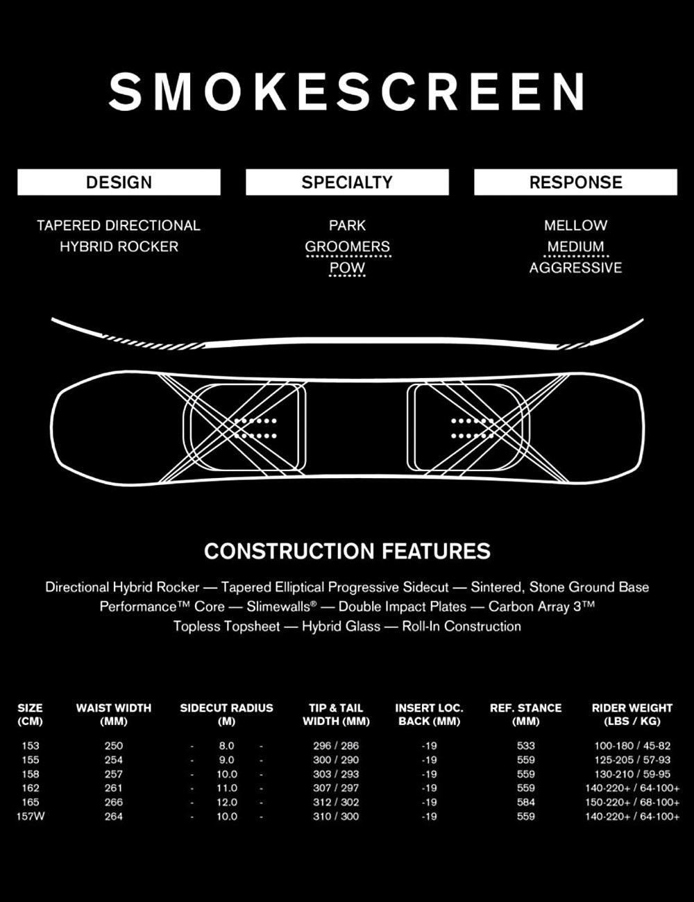 ездить на сноубордах в модели Comperecreen используется углеродная массива 3 , то есть технология радиального распределения углеродных балок, немедленно передавая сразу же Сила давления от связей до края платы позволяет вам сохранять полный контроль независимо от ширины настройки или давления. Эта технология распределения электроэнергии обеспечивает общее управление платой в каждой позиции. Благодаря ей, что дикая природа быстра и стабильна во всех условиях. slimewalls , то есть технология, запатентованная брендом и использование полиуретановых свойств, отвечает за боковую защиту и поглощение вибраций и инсультов. Уретан чаще всего используется в производстве скейтбордных колес, он дает отличную вибрационную амортизацию с большим воздействием силы и передачи энергии. в результате взаимодействия деревянных сердечников и стальных краев с снегом, со 100% контролем доски. Дополнительным преимуществом slimewalls является тот факт, что стены, изготовленные из полиуретана, практически, чем
