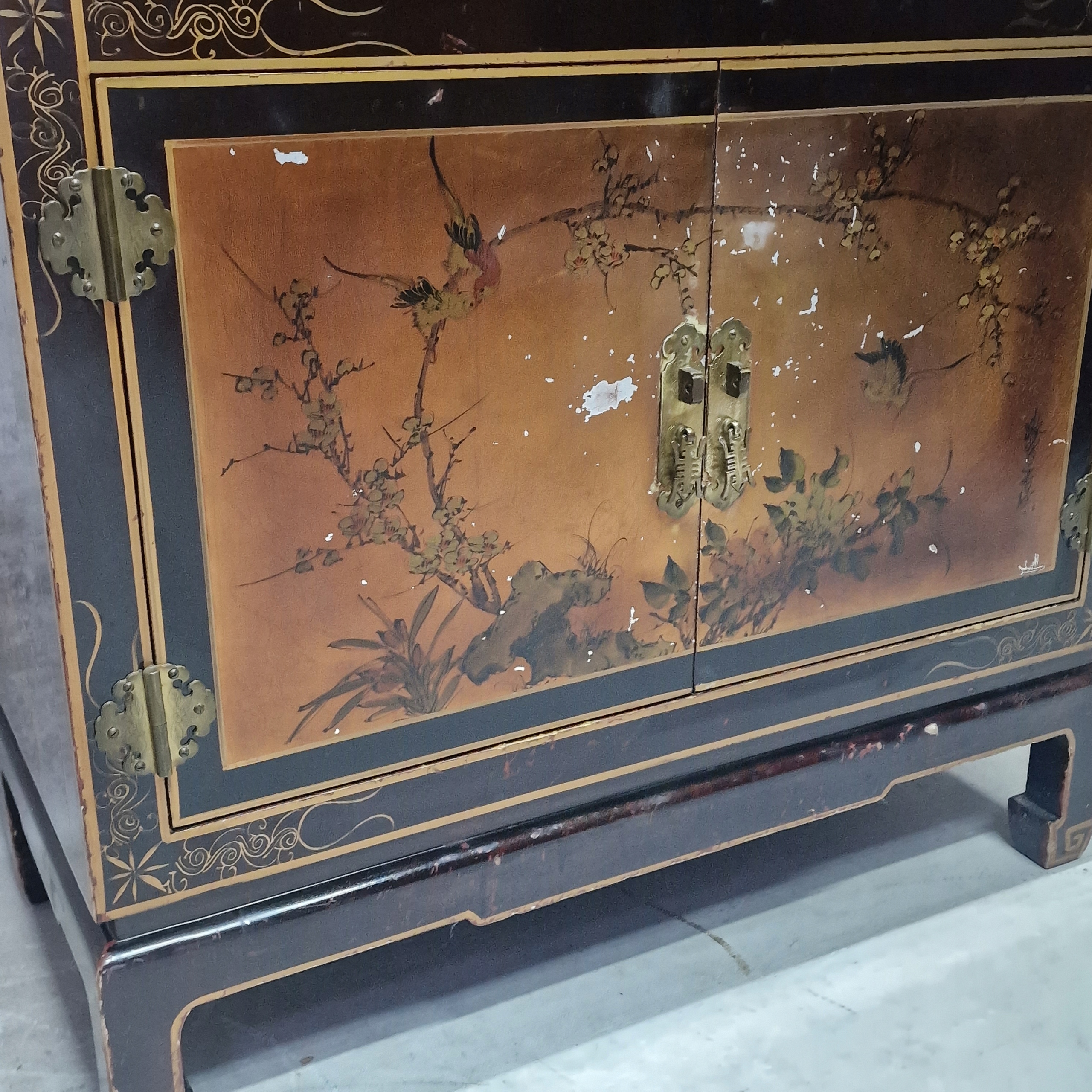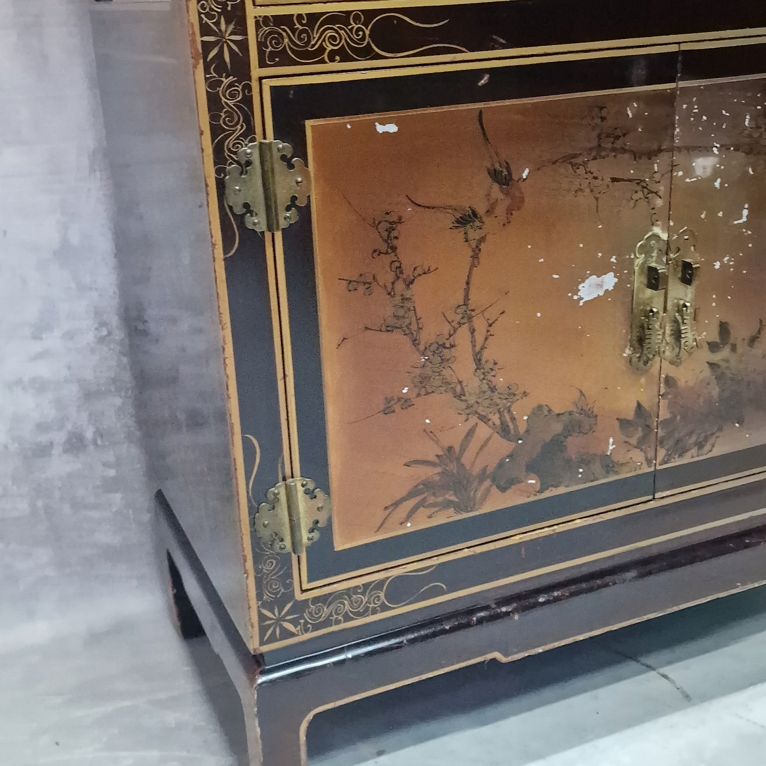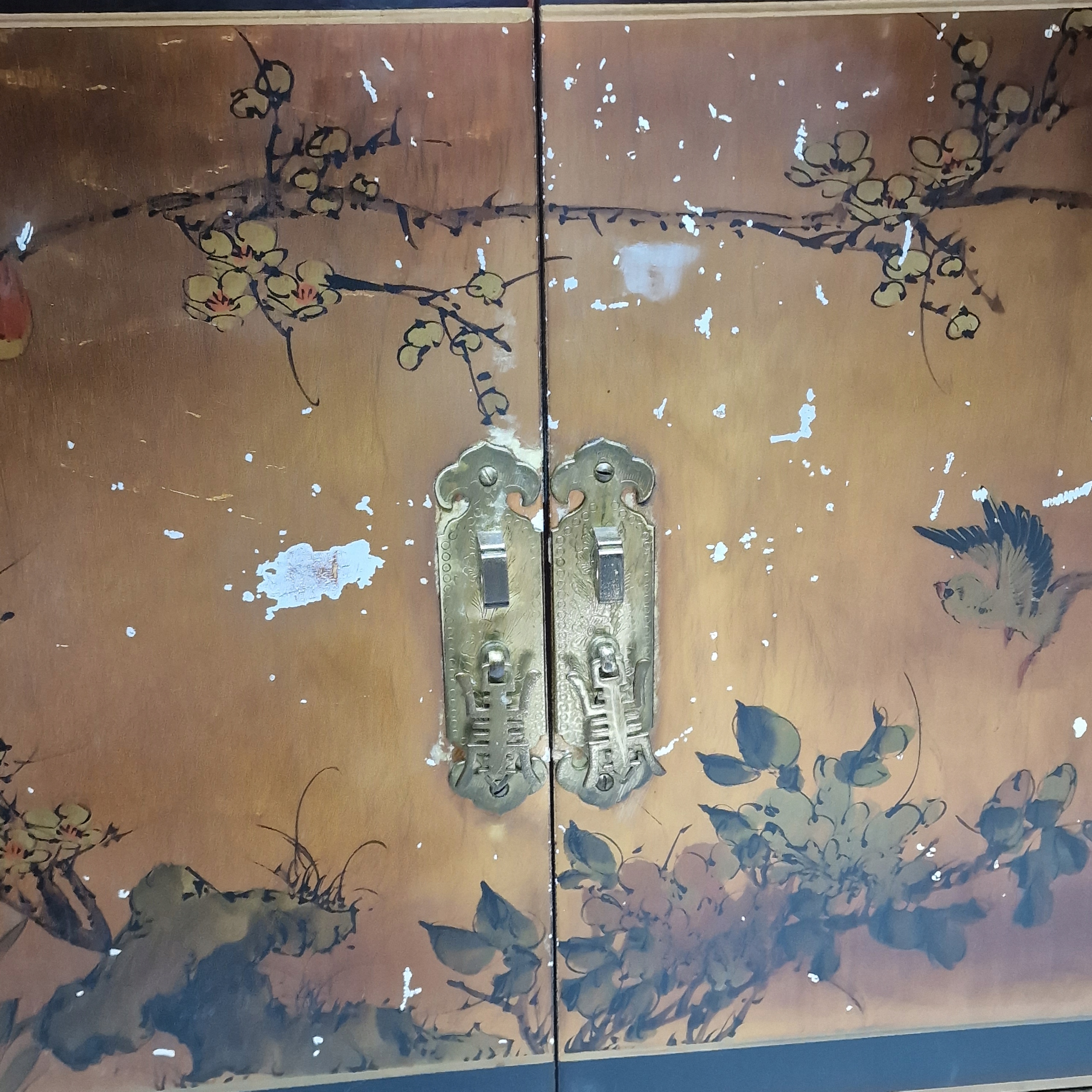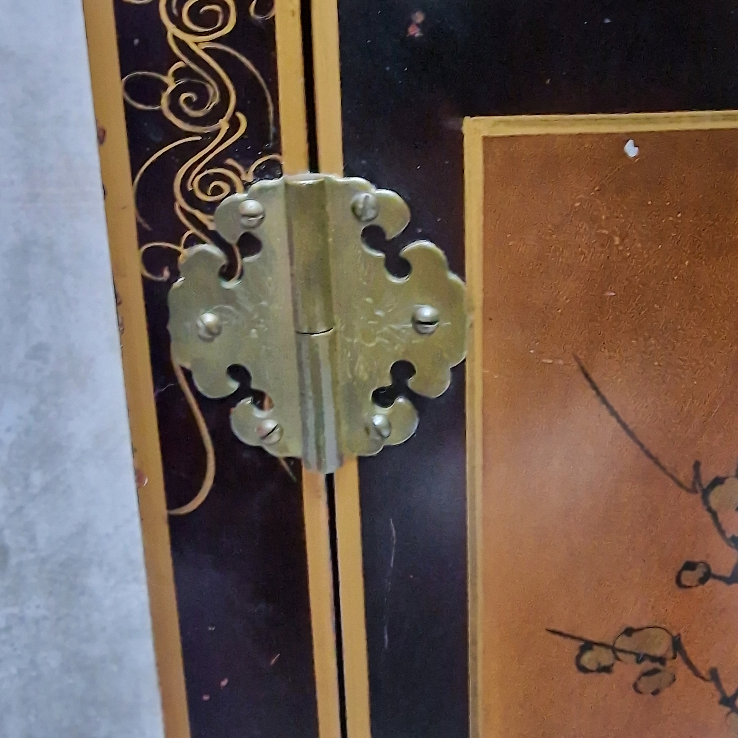 Восточный шкаф из лакированного дерева декорирован вручную, а не на машине. .