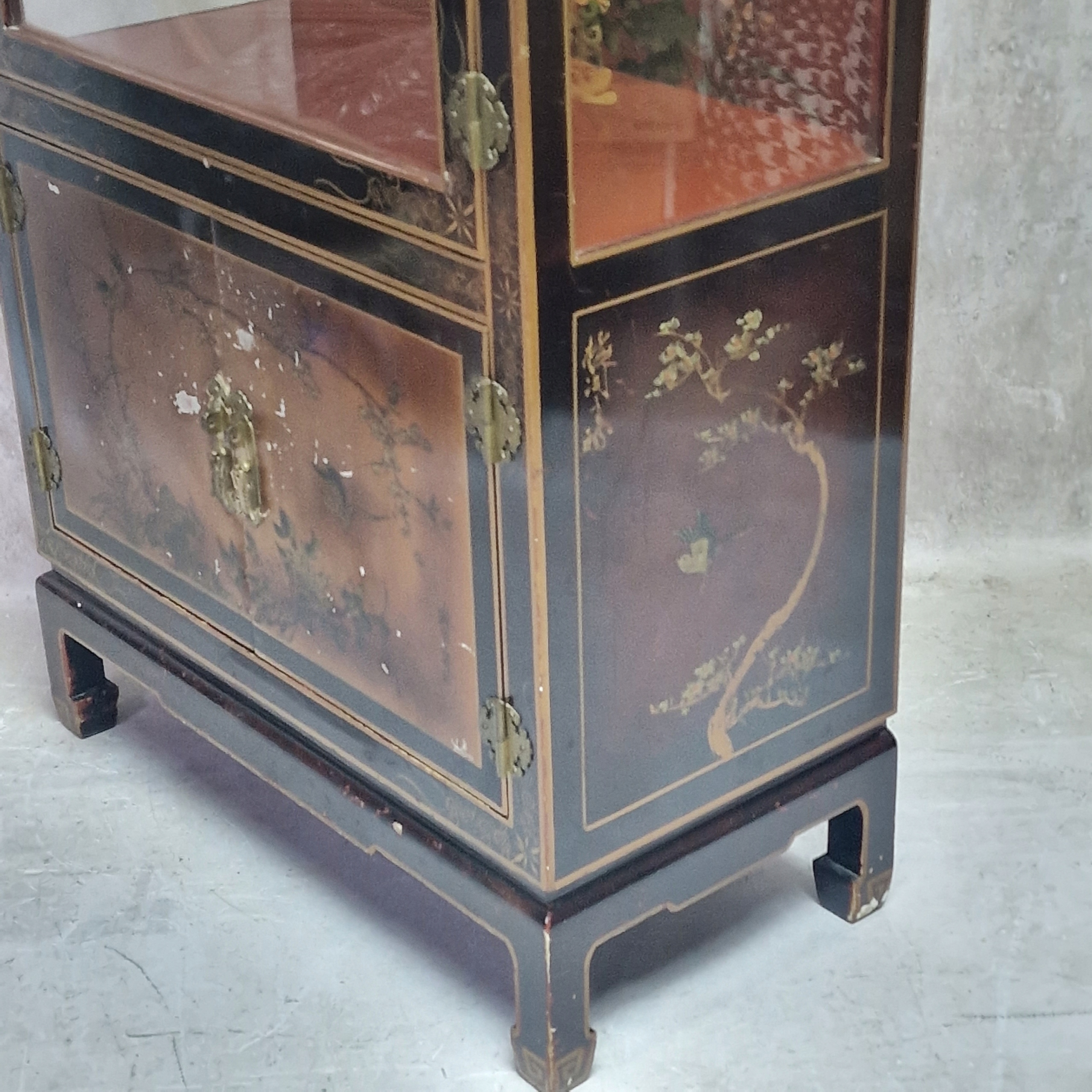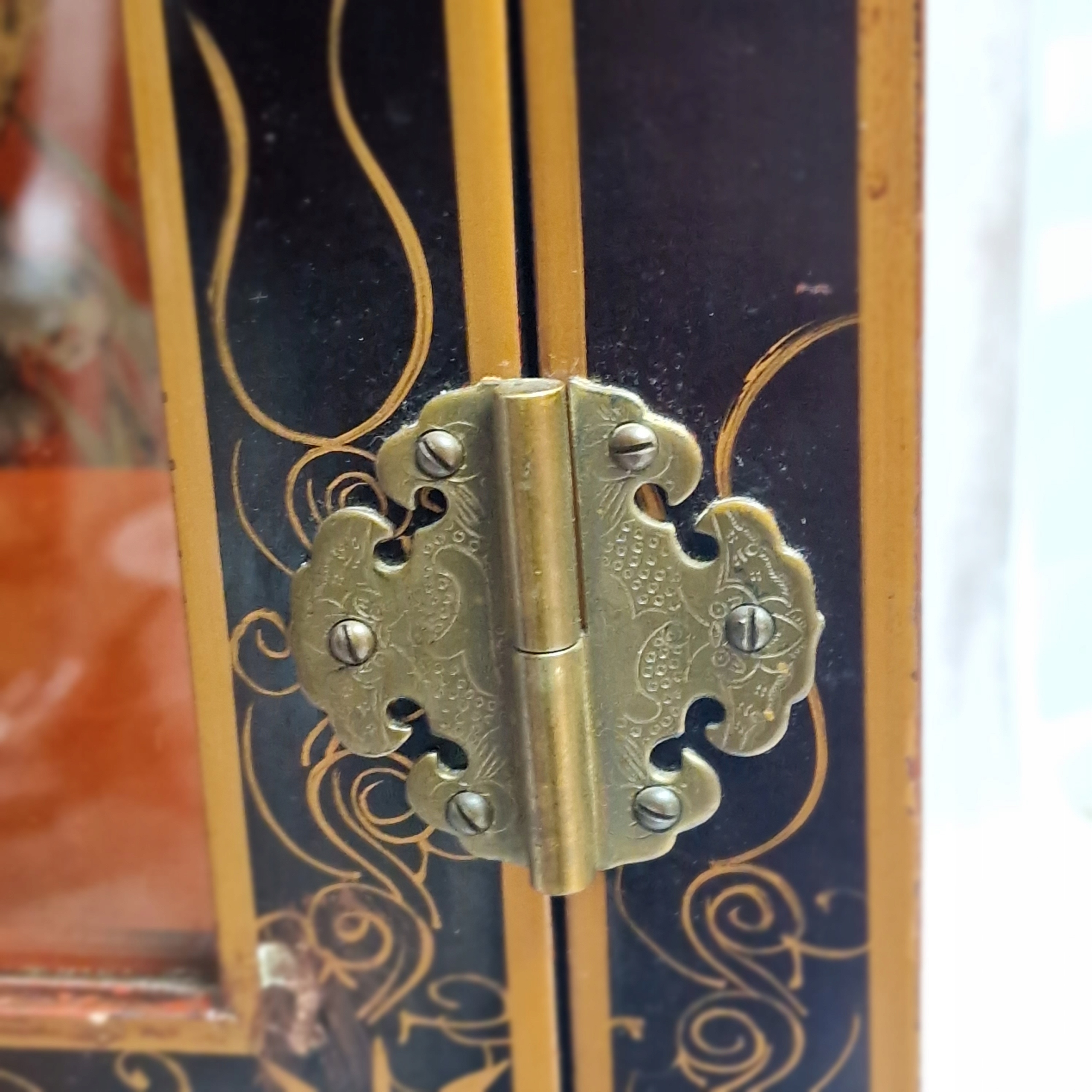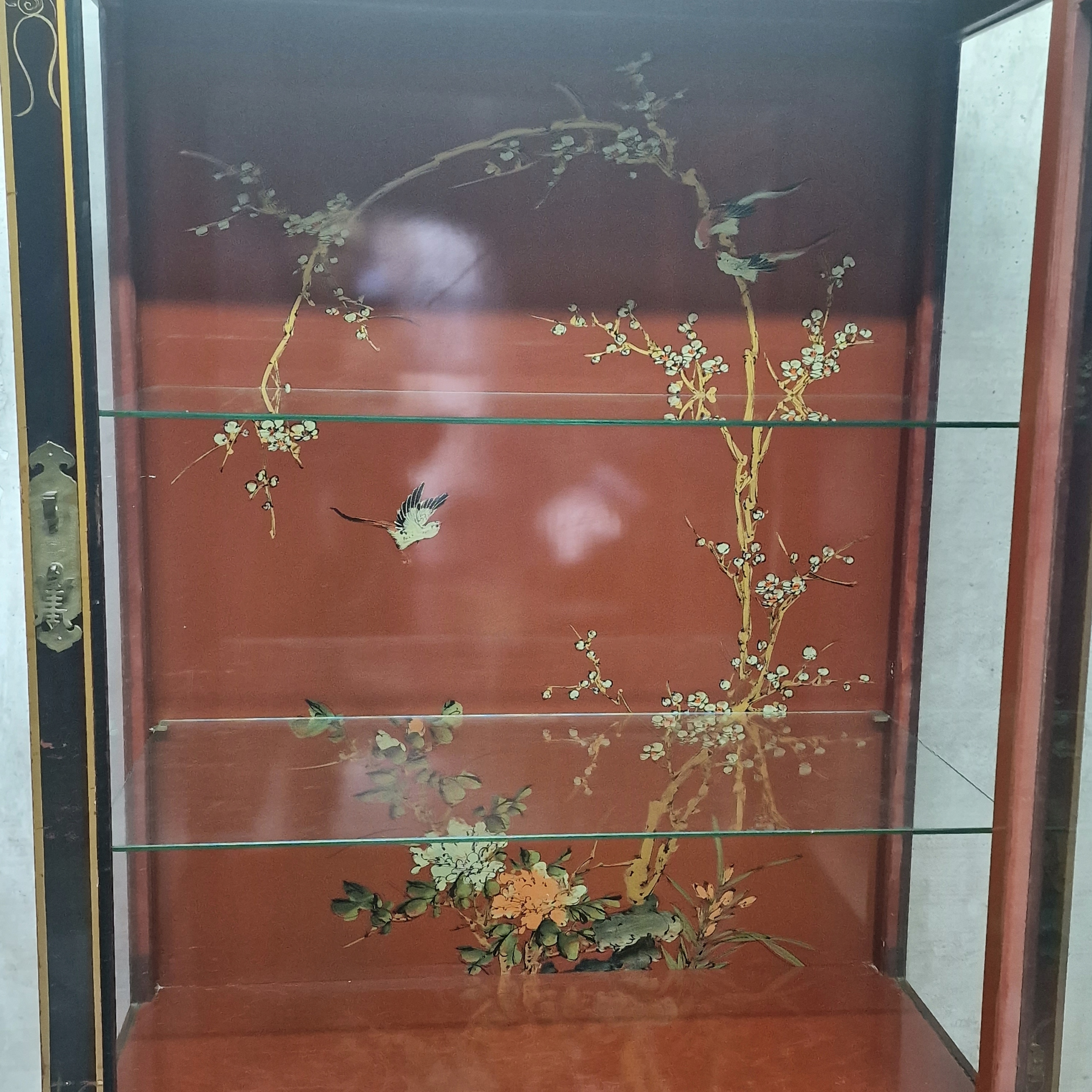 Восточный шкаф из лакированного дерева декорирован вручную, а не на машине. .