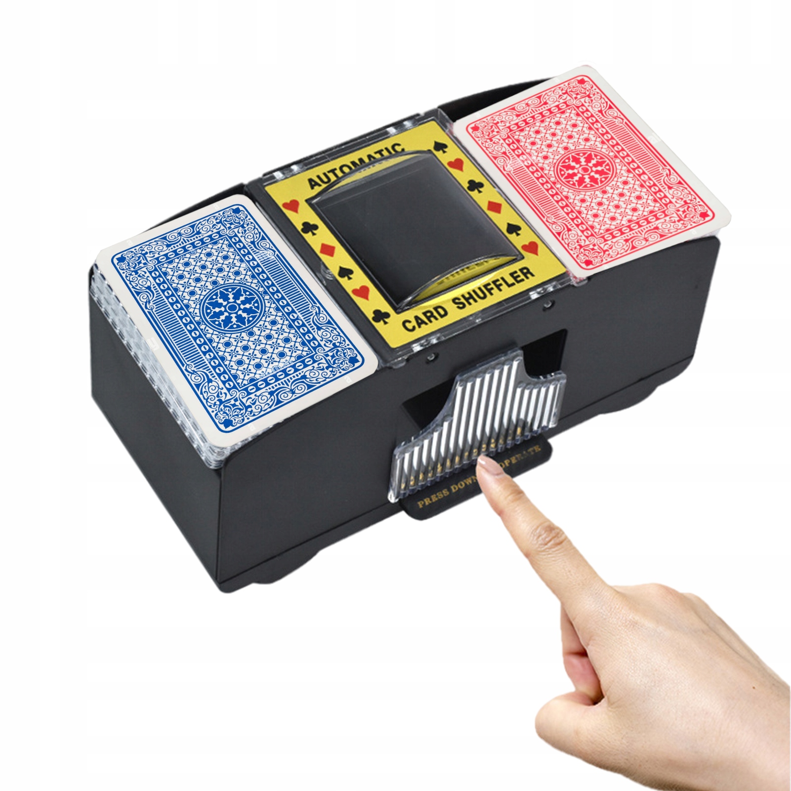 - Обеспечивает быстрое перетасовывание 2-х колод карт или одной колоды, разделенной пополам.
