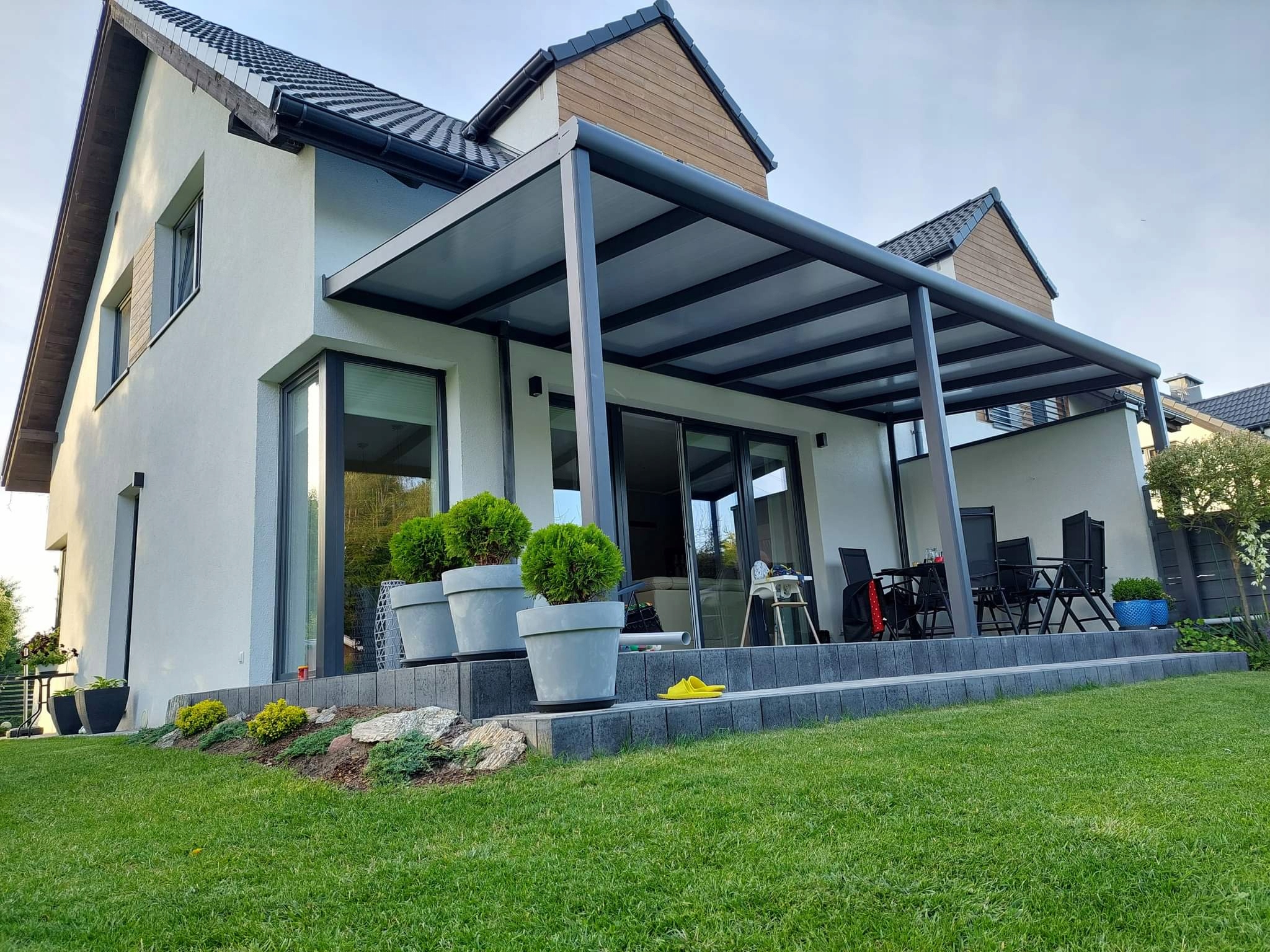Современная алюминиевая крыша Modern PRO изготовлена из толстых алюминиевых профилей и листов поликарбоната толщиной 16 мм или закаленного многослойного стекла толщиной 9,14 мм.