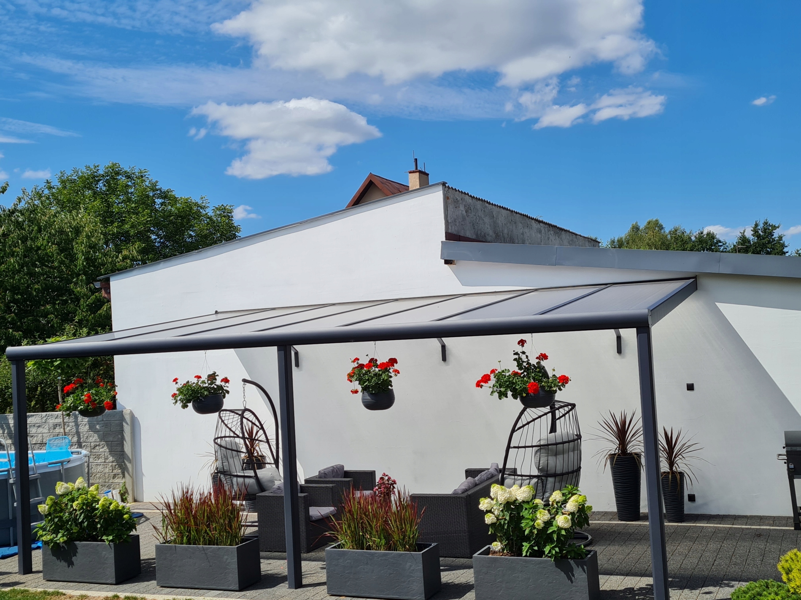 Современная алюминиевая крыша Modern PRO изготовлена из толстых алюминиевых профилей и листов поликарбоната толщиной 16 мм или закаленного многослойного стекла толщиной 9,14 мм.