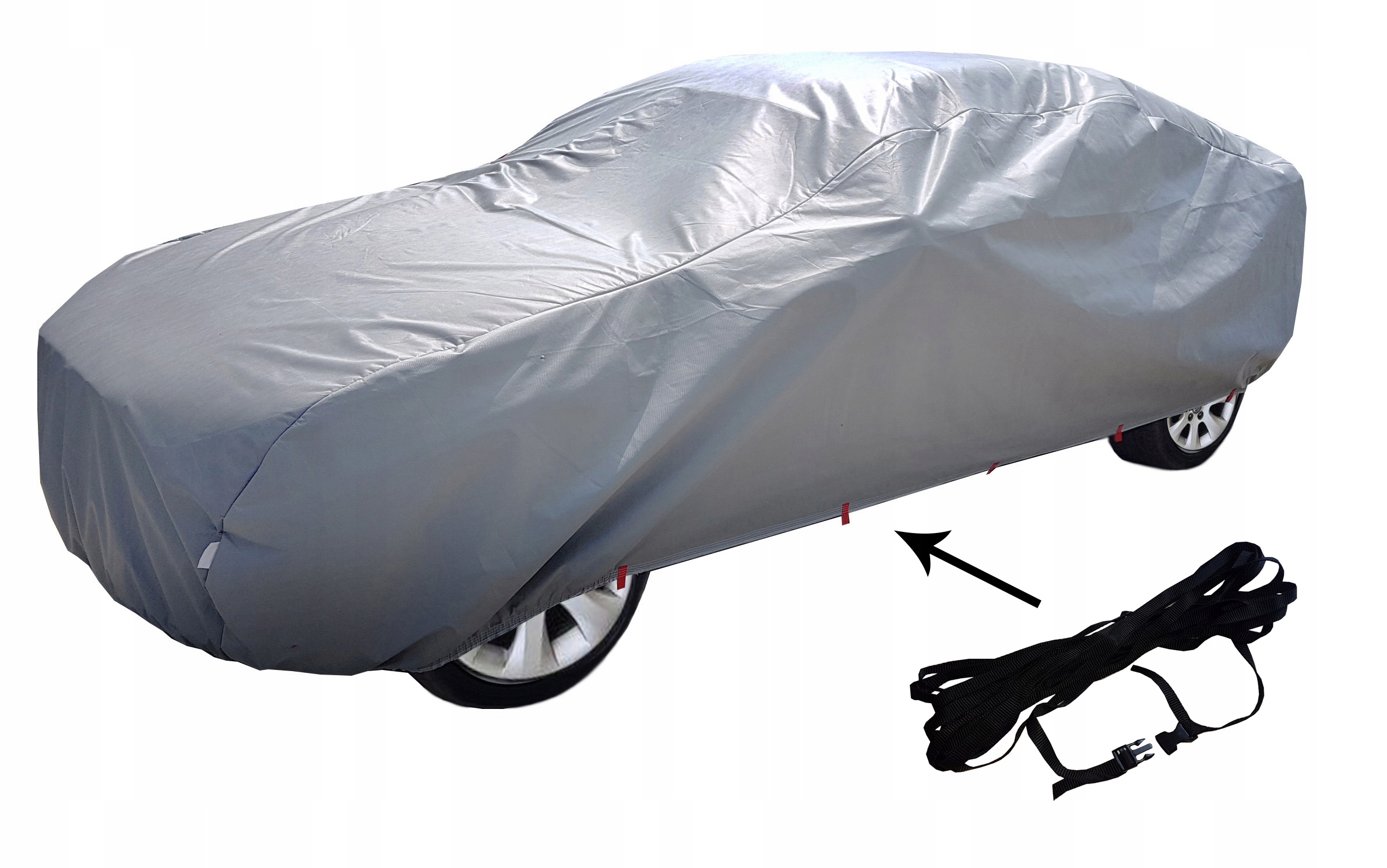 Чехол имеет прочные эластичные ленты спереди и сзади, которые проходят под бамперами автомобиля, благодаря чему он сразу остается устойчивым на автомобиле. Дополнительно чехол оснащен застежкой-ремнем с застежкой-пряжкой. Этот ремень прекрасно стабилизирует чехол по всей окружности, защищая от сильного ветра и не позволяя чехлу сорвать ветром.