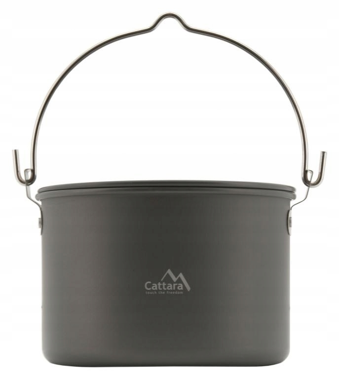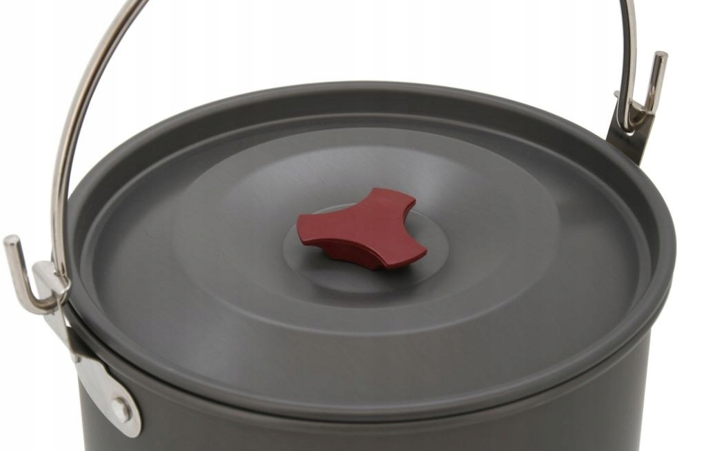 горшок изготовлен из анодированного алюминия в темно -сером. Крышка оснащена ручкой, которая обеспечивает удобную работу, а сам горшок оснащен подвеской в форме на крючке над огнем.