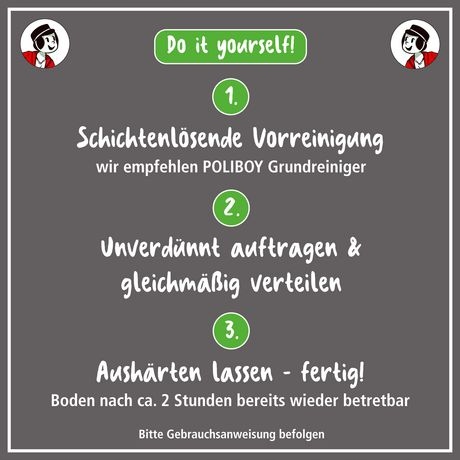 Перед использованием взболтать! Сначала хорошо вымойте пол, например, средством для чистки дерева «Полибой» (продается в нашем магазине «Аллегро»). Если вы ранее использовали на полу многослойные изделия, сначала полностью удалите слои с помощью соответствующих чистящих средств. Нанесите Poilboy Parquet Renovator полосами на чистый пол (приблизительно 100 мл на 5 м2 – без разбавления) и равномерно распределите влажной чистой тряпкой. Лучше всего использовать его систематически, покрывая поверхность как можно равномернее. Дайте высохнуть.Не используйте сильно впитывающие или безворсовые тряпки для пола, а используйте специальные швабры с чехлами. Тщательно постирайте чехлы сразу после использования. Ходить по полу можно примерно через 2 часа, но тяжелые нагрузки, такие как перемещение мебели или повторное мытье пола, следует предпринимать только через 24 часа. Повторное нанесение усиливает защитный эффект и блеск. Перед использованием проверьте совместимость пола и действие реноватора в незаметном месте, поскольку препарат создает на поверхности стойкий консервирующий слой.