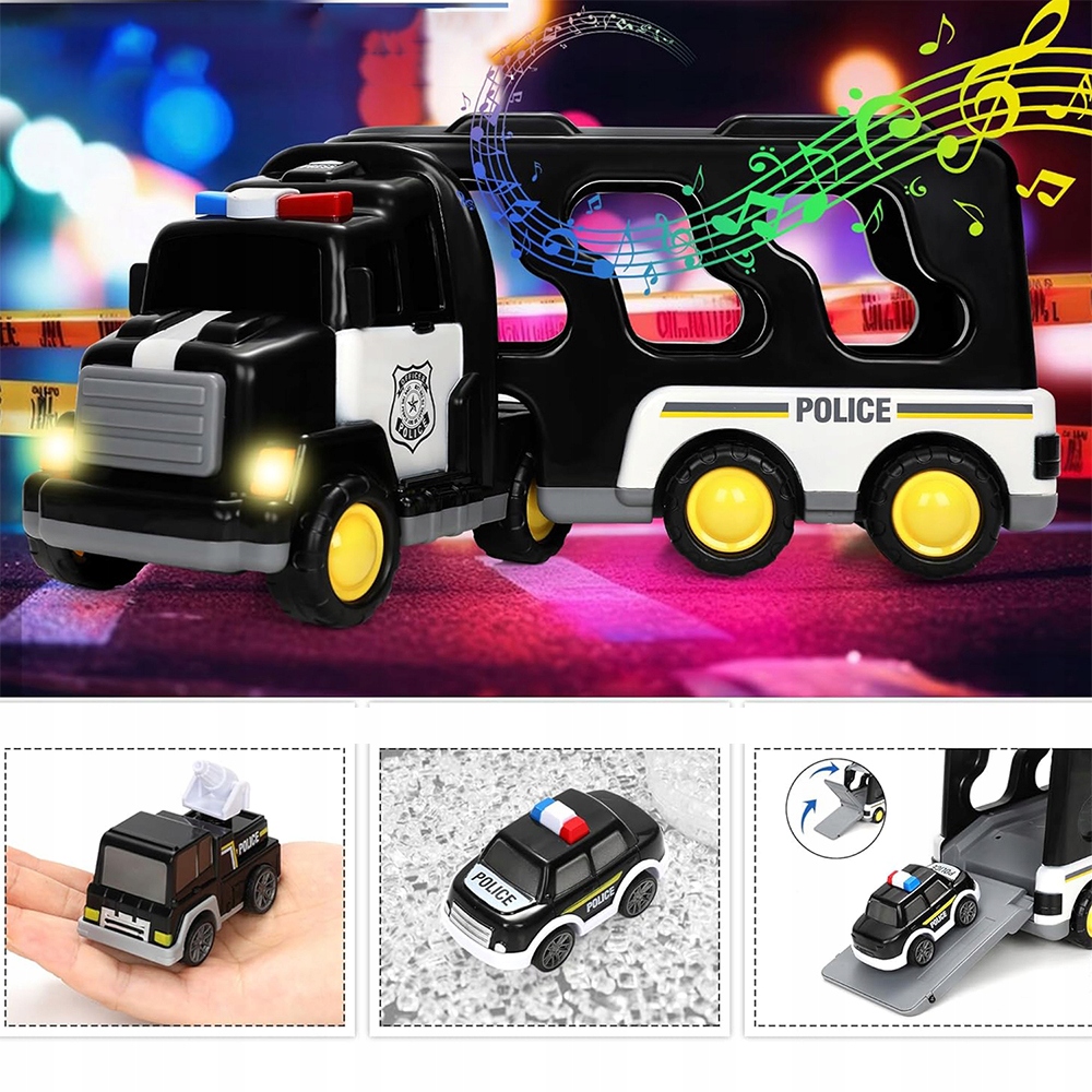 🚔🚔- Разработано для небольших любителей полиции, содержит больший транспортный грузовик, 5 небольших автомобилей и 1 маленький вертолет. Это занимает всего около 8 секунд каждый раз, когда нажата кнопка. Возьмите машину на определенное расстояние, затем отпусти свою руку, чтобы идти вперед. Кабина большого транспортного грузовика может быть отделена от грузового отсека, а задница может быть открыта для разгрузки и загрузки небольших автомобилей