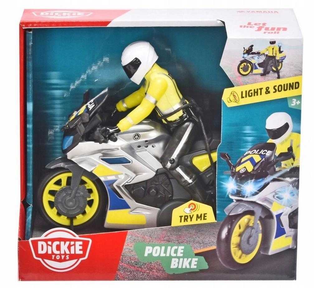 Полицейский мотоцикл со светом и звуком 3712018 от Dickie Toys переносит динамичное действие с улиц прямо в детскую комнату. Транспортное средство оснащено звуковыми эффектами – сигнальной сиреной и сопутствующими световыми эффектами – мигающим синим петухом и мигающими лампочками. В комплект входит подвижная фигурка водителя, благодаря которой дети смогут в увлекательной игровой форме познакомиться с повседневной жизнью полиции на двух колесах. Игрушка по лицензии Yamaha. Набор наверняка понравится каждому мальчику! Состав и особенности набора: Полицейский мотоцикл со звуком и светом. Кнопка включения световых и звуковых функций. Съемная фигурка с подвижными руками, ногами и головой. Надпись на мотоцикле на польском языке. Игрушка по лицензии Yamaha