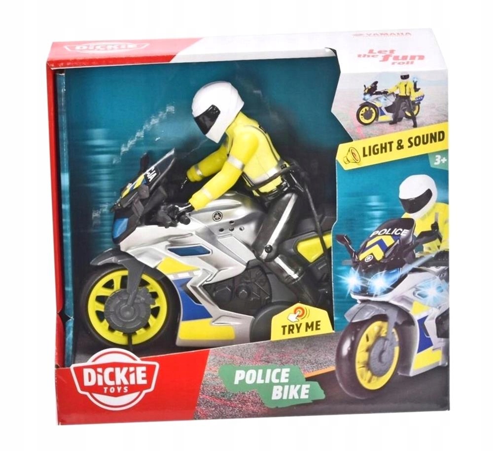 Полицейский мотоцикл со светом и звуком 3712018 от Dickie Toys переносит динамичное действие с улиц прямо в детскую комнату. Транспортное средство оснащено звуковыми эффектами – сигнальной сиреной и сопутствующими световыми эффектами – мигающим синим петухом и мигающими лампочками. В комплект входит подвижная фигурка водителя, благодаря которой дети смогут в увлекательной игровой форме познакомиться с повседневной жизнью полиции на двух колесах. Игрушка по лицензии Yamaha. Набор наверняка понравится каждому мальчику!
