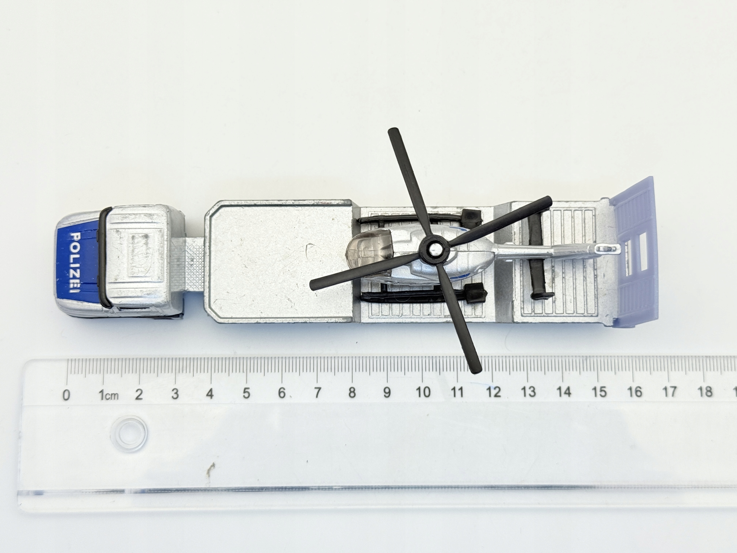 Сику-ресорак, изображающий грузовик с полицейским вертолетом, представляет собой уникальное сочетание транспорта и авиации в масштабе 1:87.