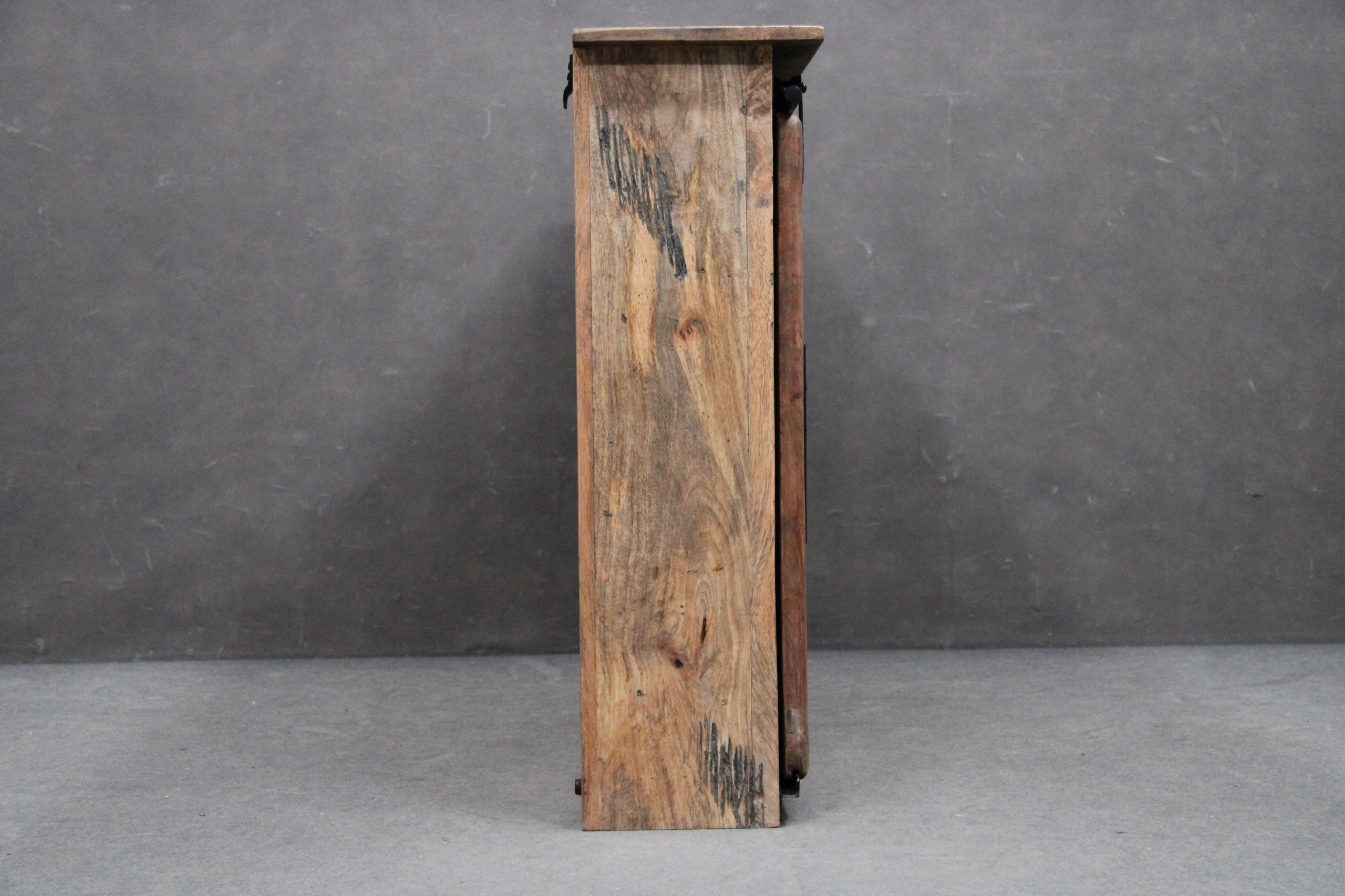 Шкаф новый. Изготовлен из древесины индийского манго. Каждый предмет мебели уникален благодаря ручному изготовлению и породе дерева. Она отличается расцветкой и структурой дерева (мелкие трещинки, дырочки, ажурные углубления, которые специально сделаны), что подчеркивает индивидуальность мебели. Двери выполнены в индустриальном стиле на роликах с металлической отделкой фасадов.