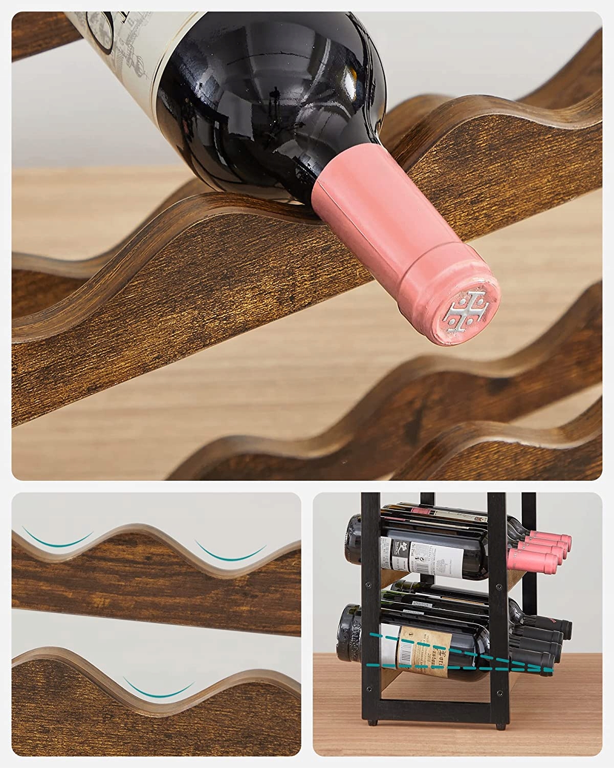 Он изготовлен из высококачественного МДФ и бамбука, что гарантирует долговечность и прочность. Уникальный волнообразный дизайн предотвращает раскачивание, сохраняя ваши бутылки безопасными и устойчивыми.