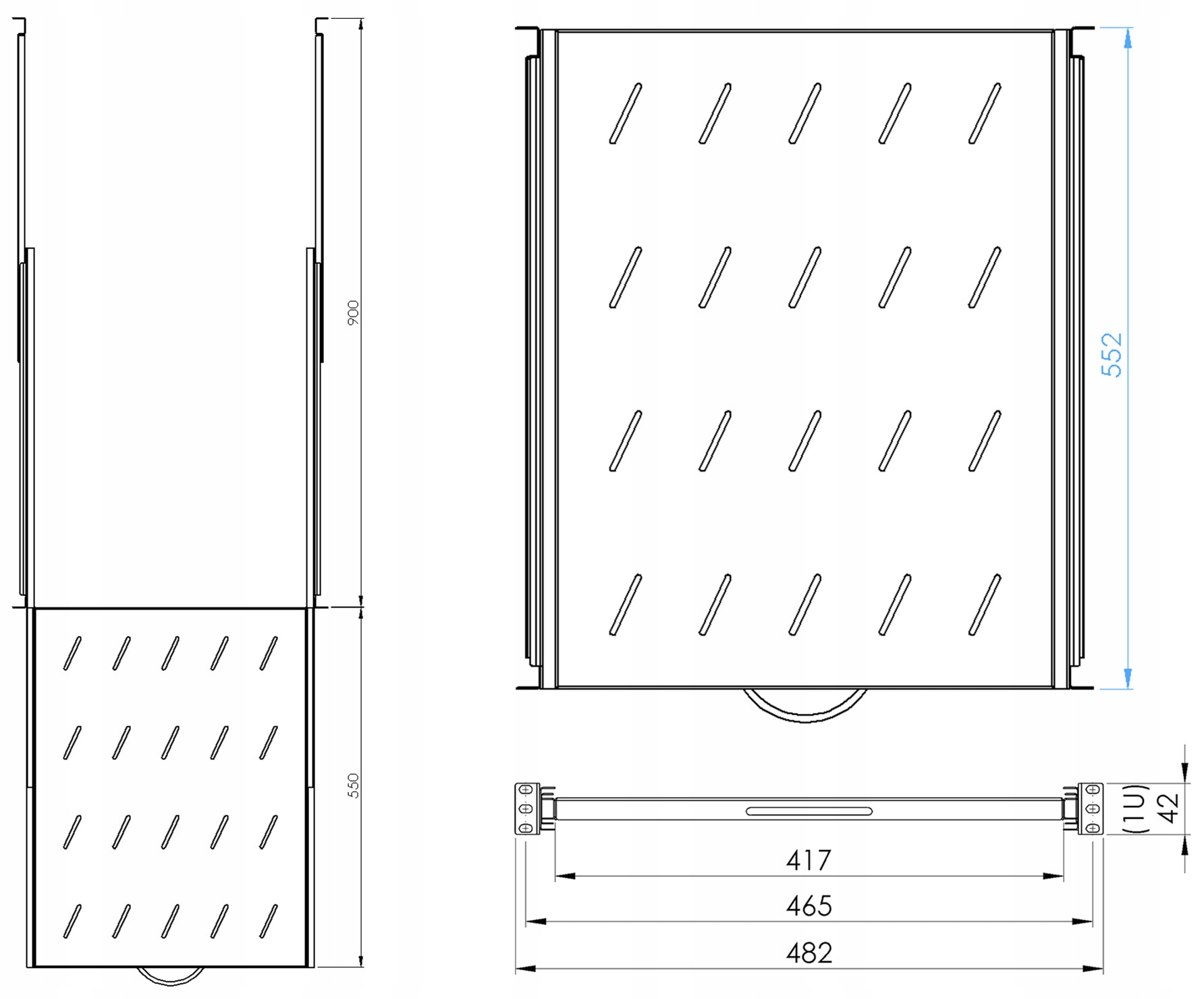<р> Полка выдвигается на 550 мм относительно передних монтажных направляющих. Расстояние между монтажными рейками: мин. 550 мм, макс. 900 ммРазмеры: 482 х 552 х 42 мм