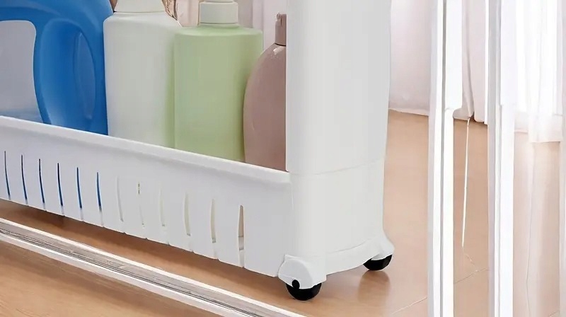 Благодаря прочным колесам и глубине всего 12,5 см ее можно легко вставить в любой зазор — между стиральной машиной и стеной, рядом с холодильником или под столом.