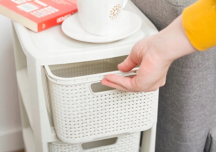 Изделие состоит из 5 контейнеров, выполняющих функцию ящиков. Они сделаны из пластика, но похожи на корзины из ротанга. Благодаря этому они выглядят очень эстетично.