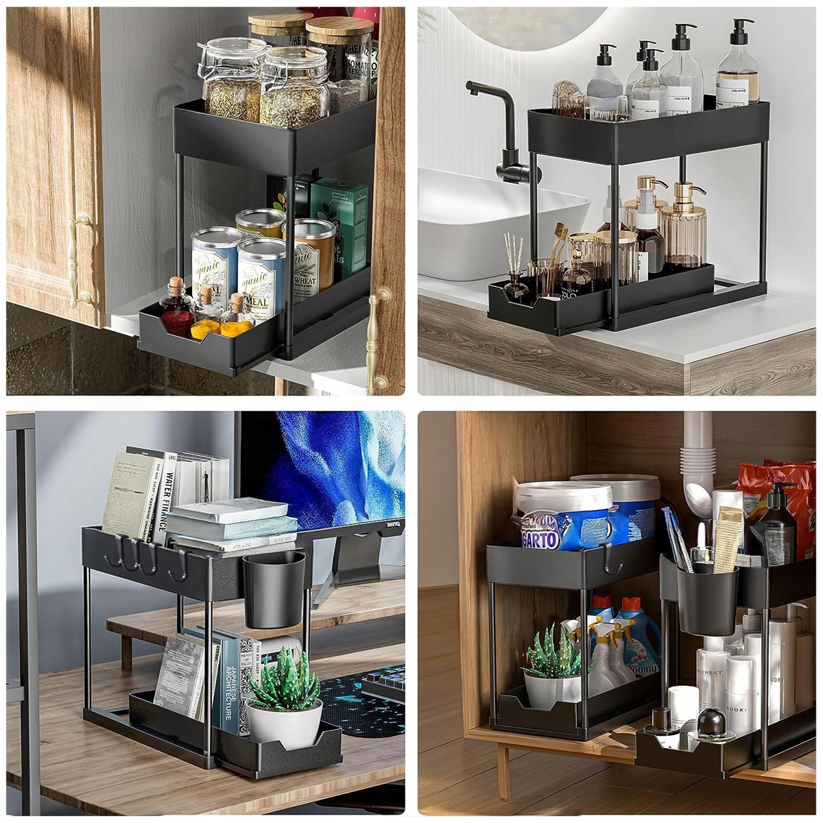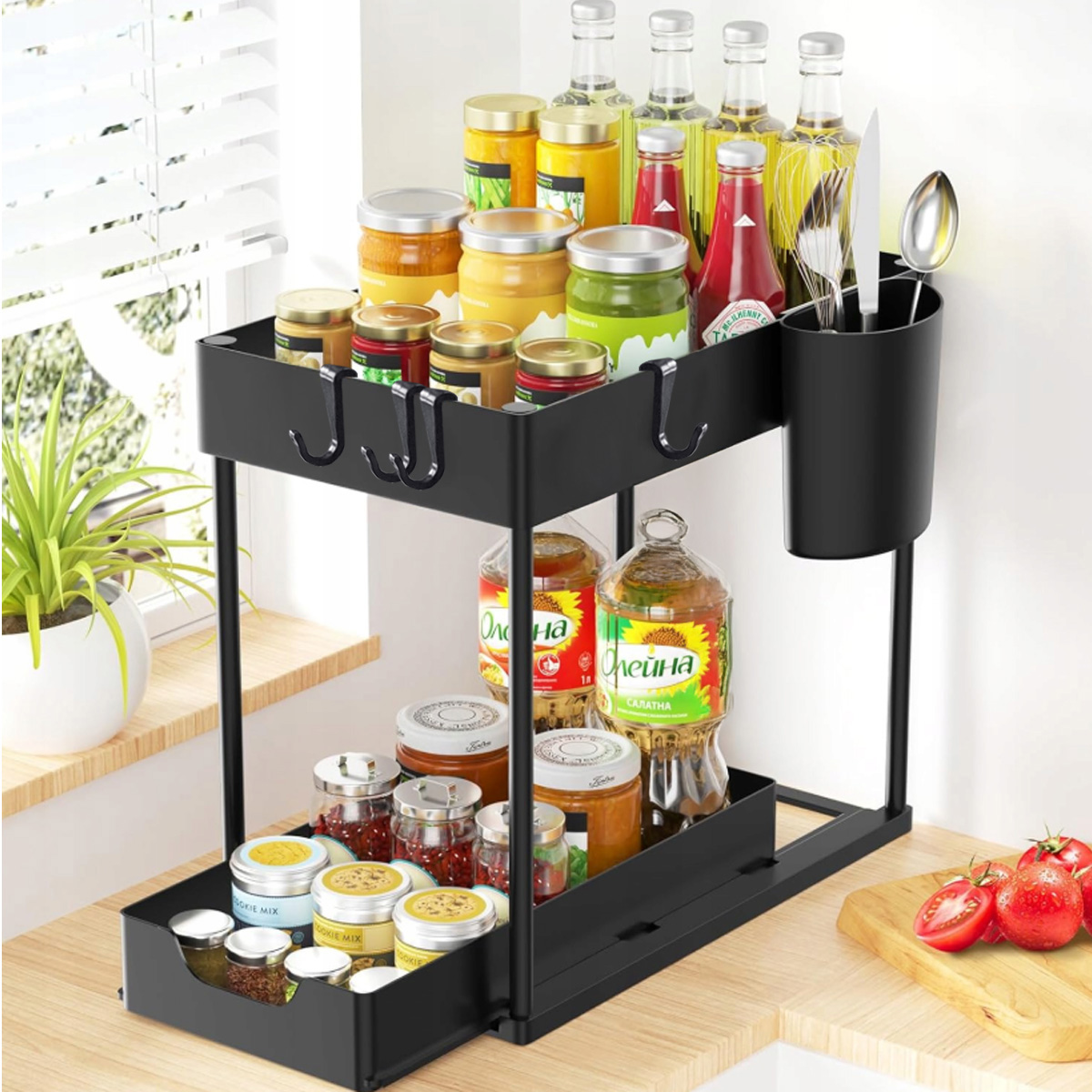 Организатор оснащен двумя полками , которые позволяют максимально использовать пространство в шкафу или на столешнице.