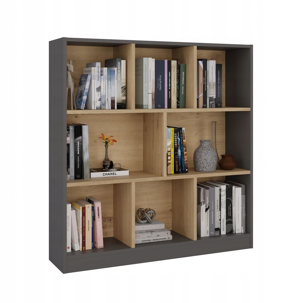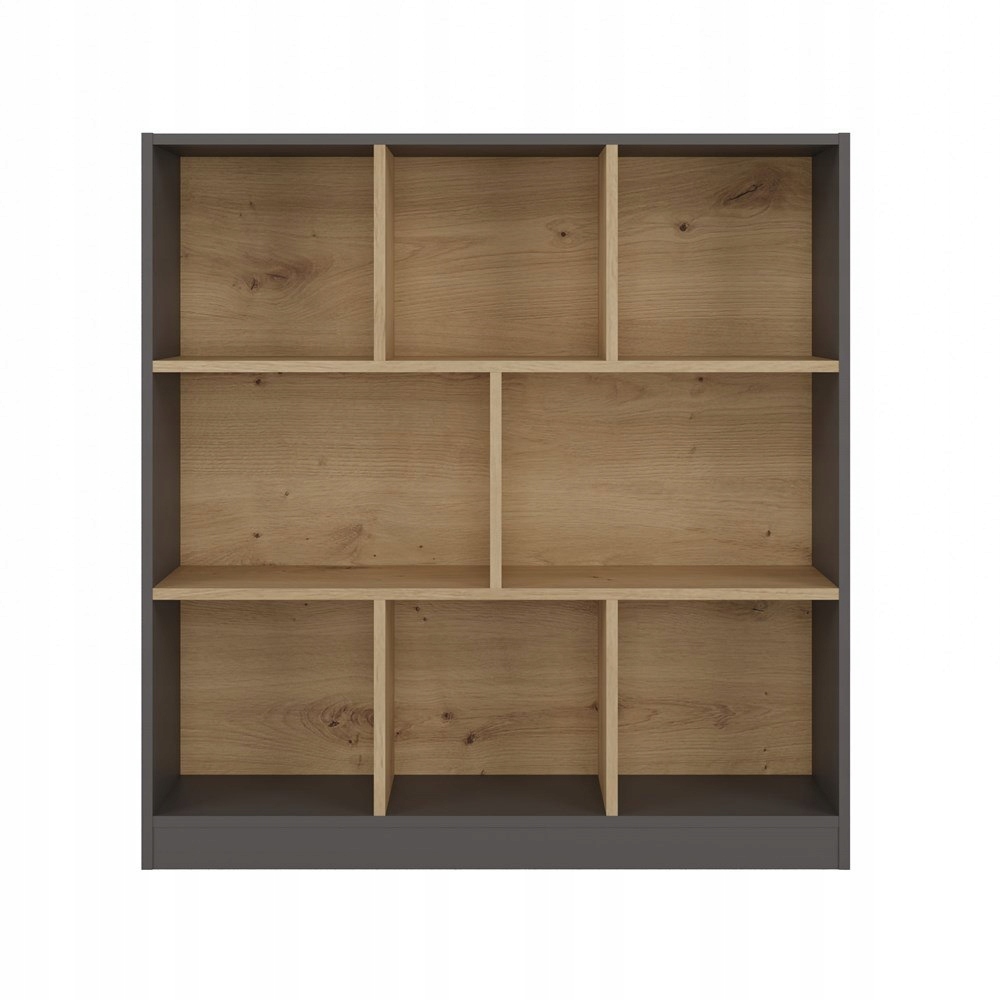 Благодаря 8 просторным и пропорционально расположенным отделениям полка FIESTA 8P позволяет эстетично хранить книги, документы, украшения и коробки. Декоративное сочетание глубокого антрацита с теплым ремесленным дубом придает интерьеру современный и уютный характер.