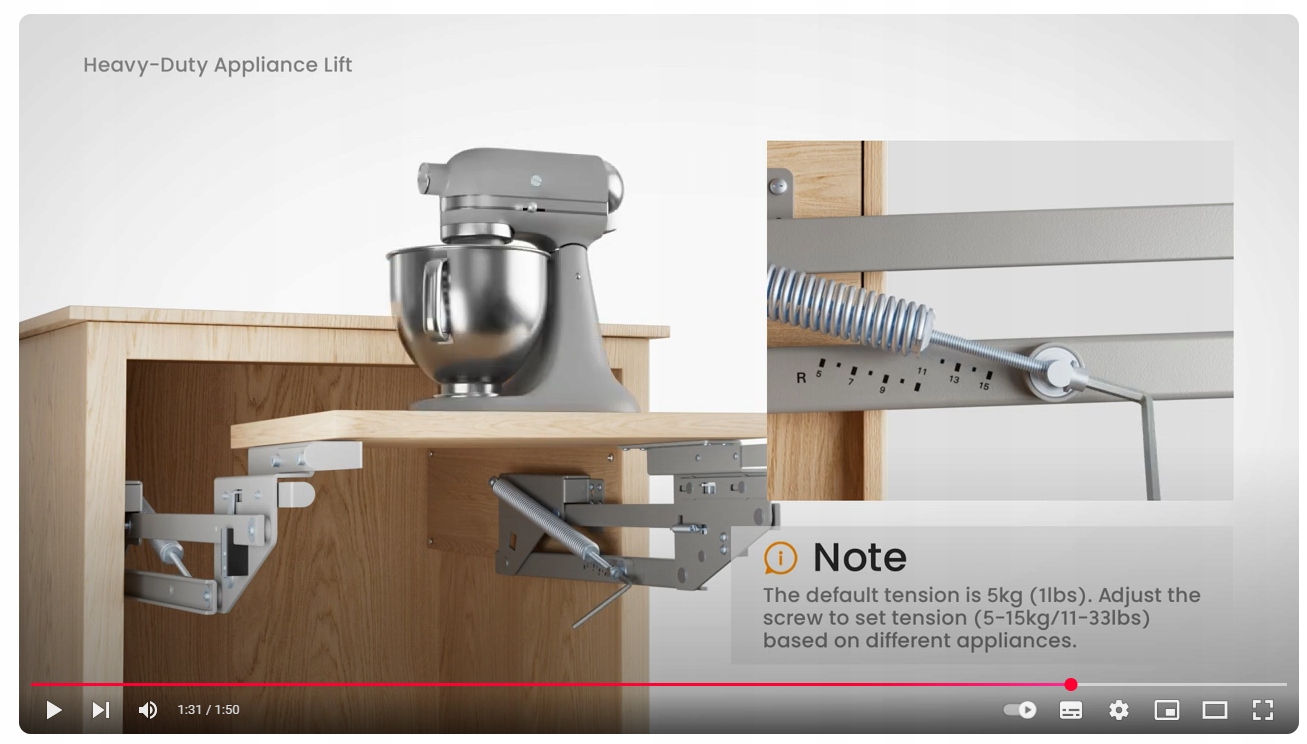 Лифт был разработан для установки в шкафах и поддерживает нагрузку в диапазоне от 5 до 20 кг, что позволяет хранить различные виды кухонных аксессуаров, тяжелые суда, кухонные роботы, микроволны, миксеры или термомикс. Пружины позволяют отрегулировать силу сопротивления на нагрузку.
