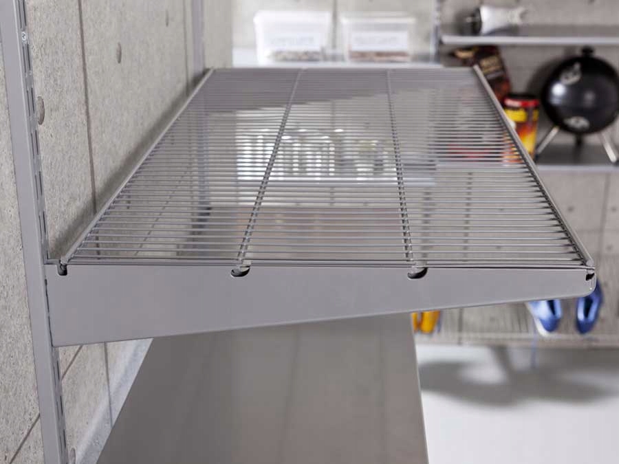 Полки крепятся с помощью кронштейнов Vario к несущим полосам U (двухрядные). Полки можно обрезать по ширине, например. до 60 см (кронштейны можно крепить в любом месте проволочной полки)