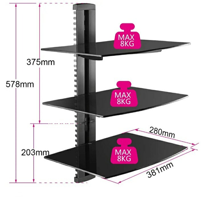 - Надежность: Наша настенная полка состоит из одной большой полки из армированного закаленного стекла (каждая полка 380 x 280 x 5 мм). Предназначен для DVD/Blu-ray, спутниковых/кабельных плееров, игровых консолей, акустических систем Hi-Fi и объемного звучания.