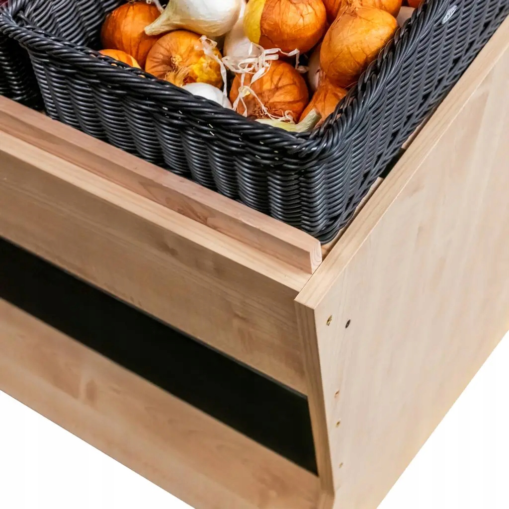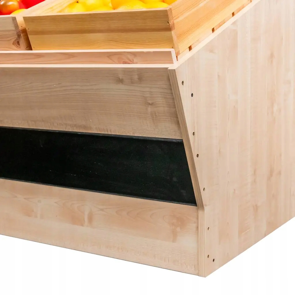 Верхнюю полку можно отрегулировать по желаемой высоте, обеспечивая легкий доступ к выставленным продуктам. Прочная и устойчивая конструкция из металла в сочетании с элегантной отделкой мебельным щитом придает острову не только эстетичный, но и долговечный вид. Дополнительно можно разместить овощи и фрукты в ящиках на нижней полке, что добавляет элегантности и делает их еще более привлекательными для покупателей.