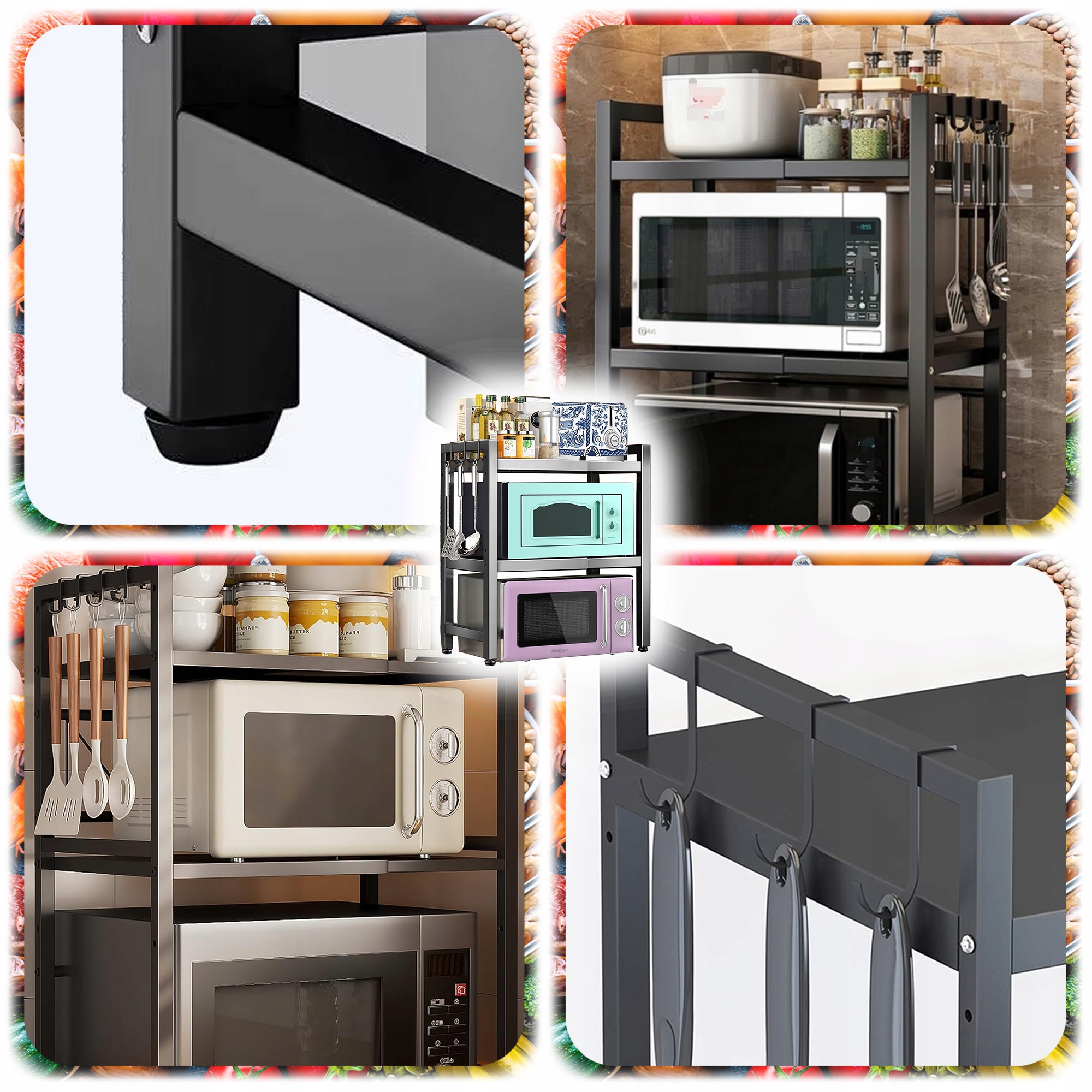 ПОДСТАВКА ДЛЯ МИКРОВОЛНОВОЙ ПЕЧИ ПОЛКА КУХОННАЯ СТОЙКА, ЧЕРНАЯ, ВЫДВИЖНАЯ + 6 КРЮЧКОВ
