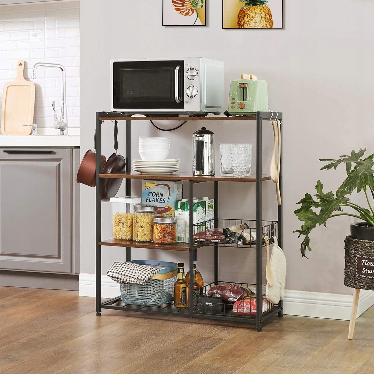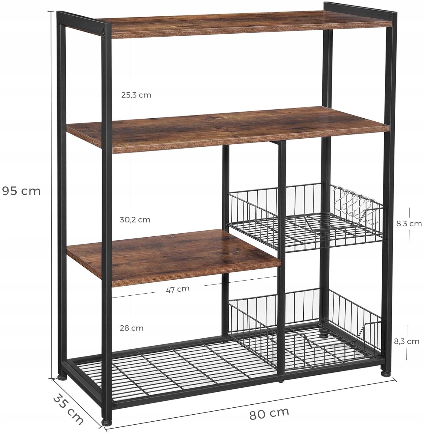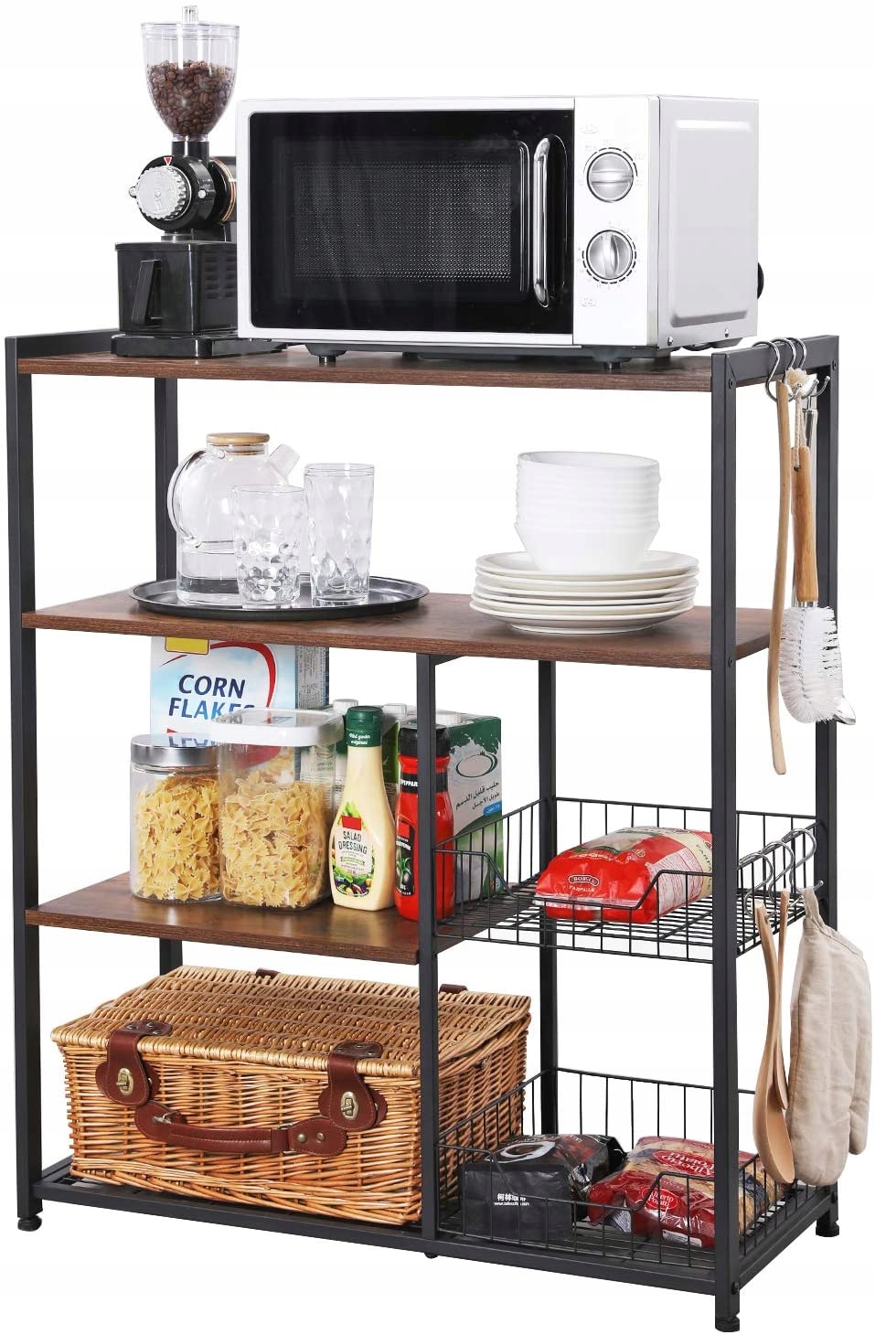 Полка с 2 сетчатыми корзинами для фруктов глубиной 9 см и 6 крючками для одежды или посуды облегчает приготовление пищи и повседневную жизнь. Прямоугольная стальная трубчатая конструкция толщиной 15 х 30 мм, прочные полки из романтического дерева в деревенском стиле и регулируемые ножки обеспечивают устойчивость и равновесие полки.