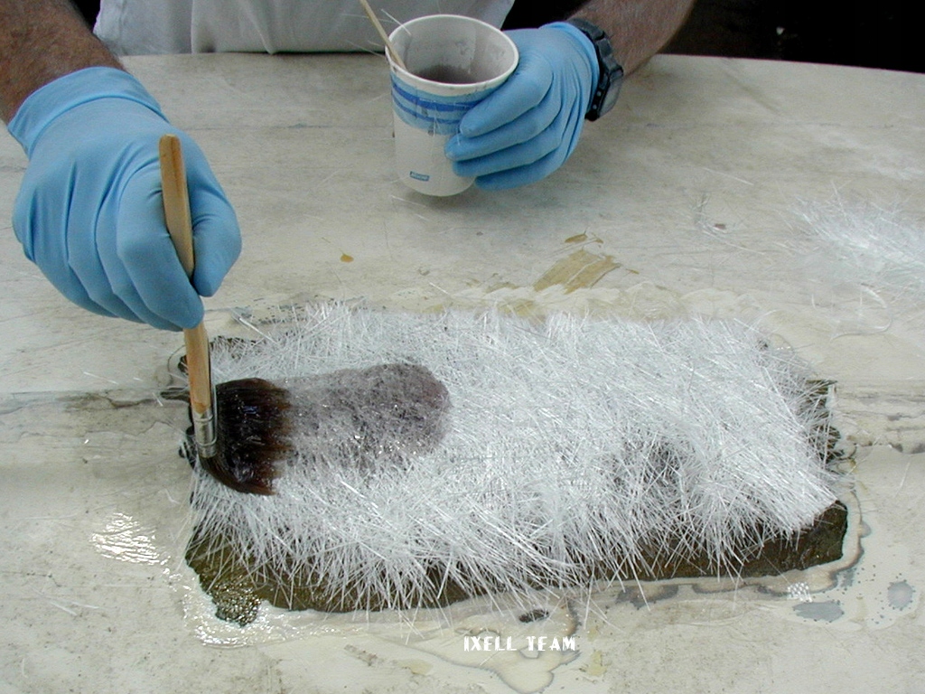 Нанесите стекломат, прижмите его и пропитайте смолой с помощью кисти; можно нанести несколько слоев мата.