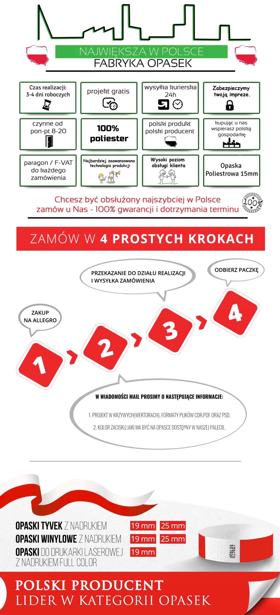 Чтобы персонализировать свой браслет из полиэстера толщиной 15 мм с односторонним принтом, отправьте дизайн на адрес электронной почты после совершения покупки. В теме электронного письма укажите свой псевдоним Allegro и «Дизайн браслета».
