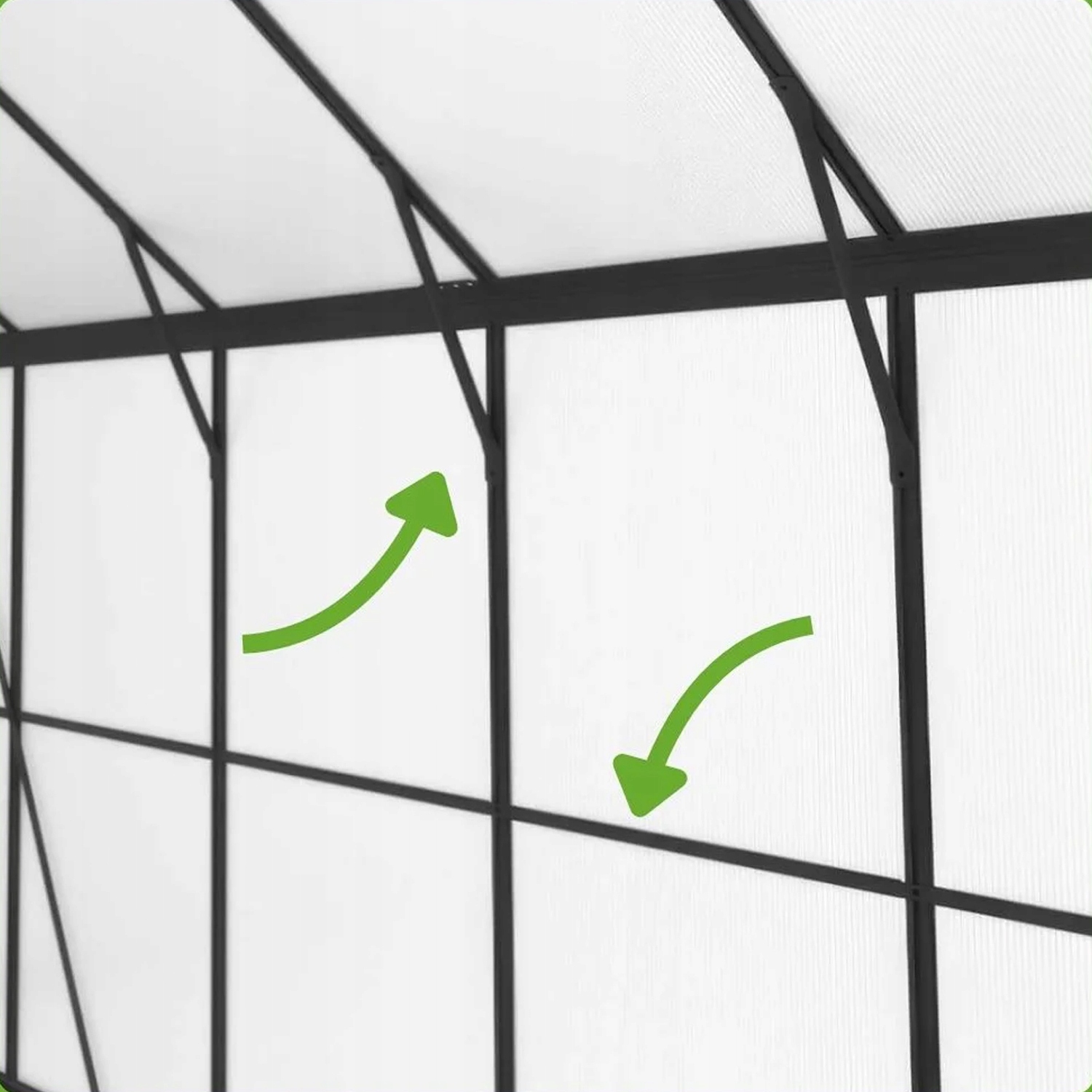 Прочный и прочно армированный порог значительно увеличивает долговечность всей конструкции. Благодаря этому теплица остается устойчивой и устойчивой к нагрузкам даже при интенсивном и частом использовании.
