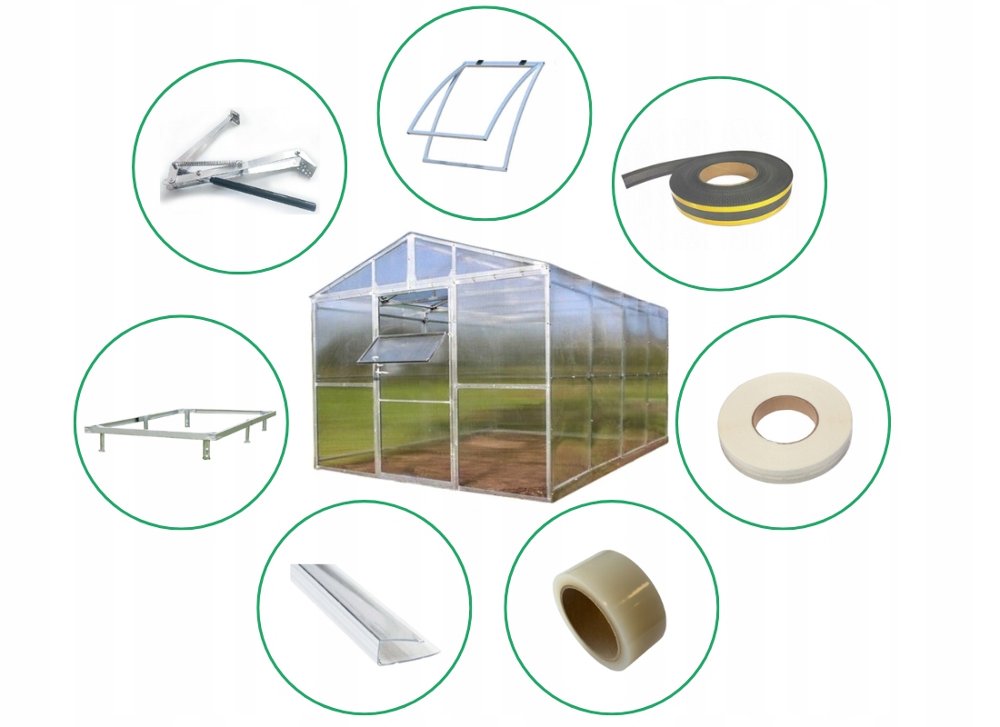 Все элементы, необходимые для сборки, включены. Фотография в предложении показывает предмет продажи, но его оборудование отличается. Болты скелета гольтера, специальные винты с резиновым уплотнением EPDM для установки поликарбоната.