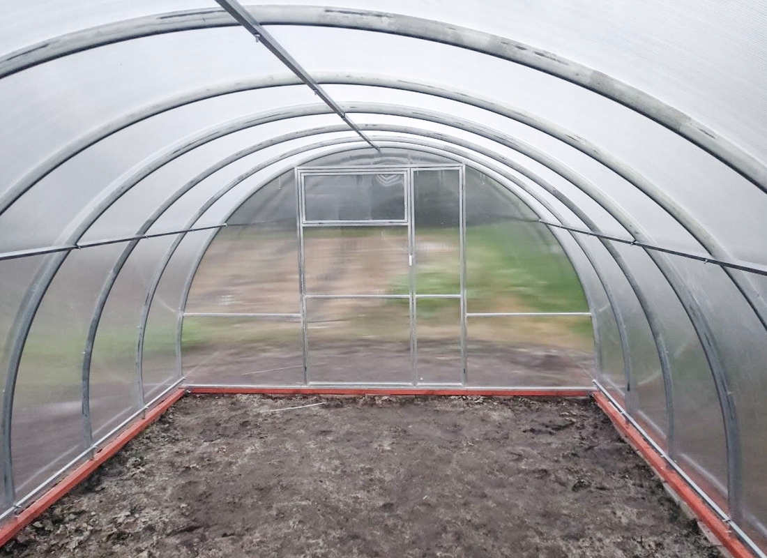 Теплица имеет две двери с каждой стороны. В дверях теплицы уже установлены окна.