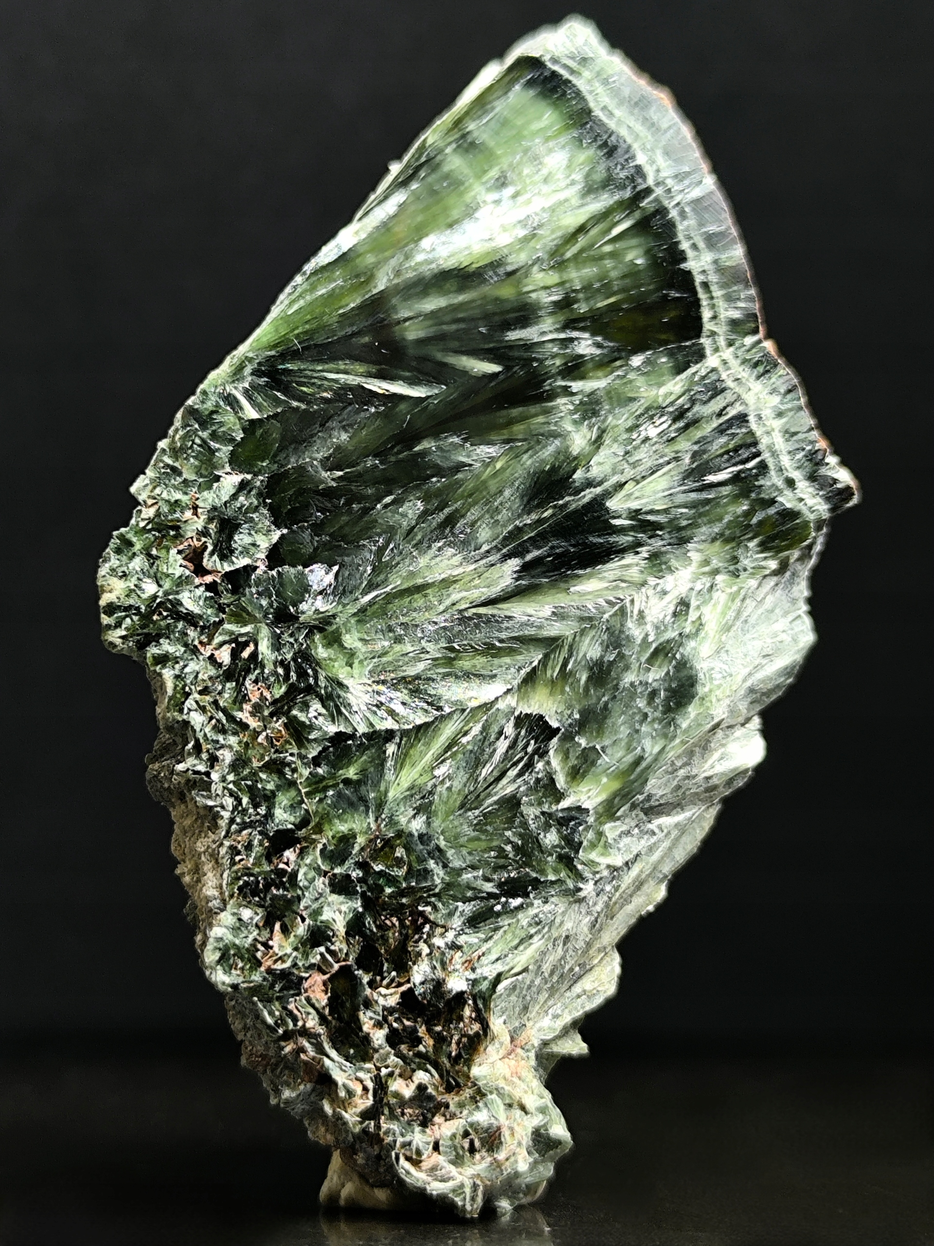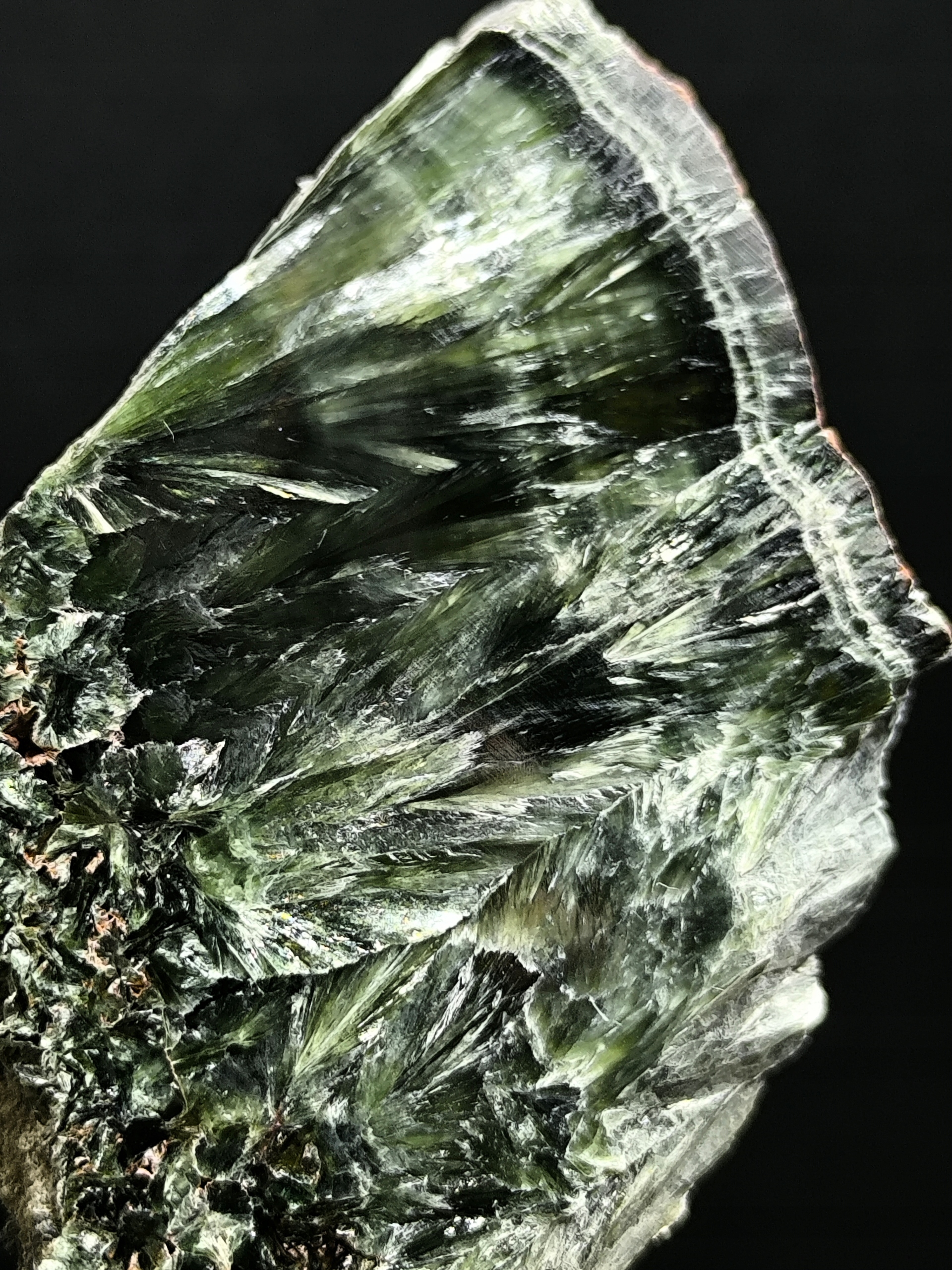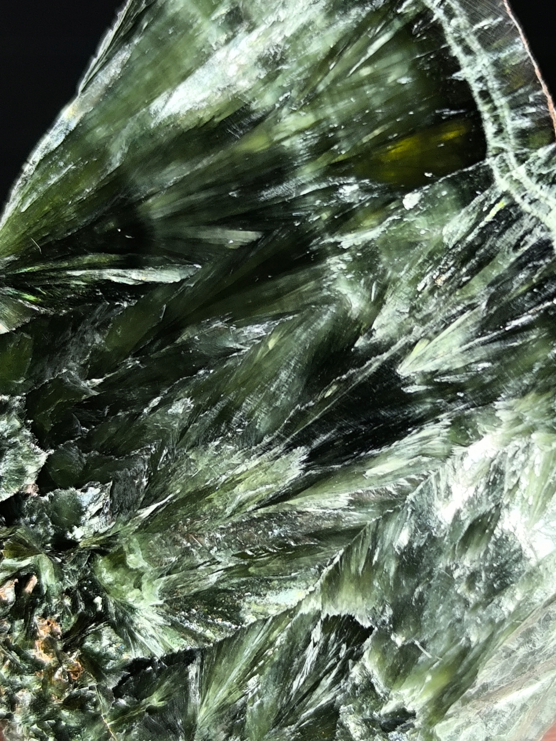 Предмет продажи — серафинитовая плитка. Камень отполирован с одной стороны, что позволяет ему полностью раскрыть характерную зелено-серебристую структуру с перьевым рисунком.