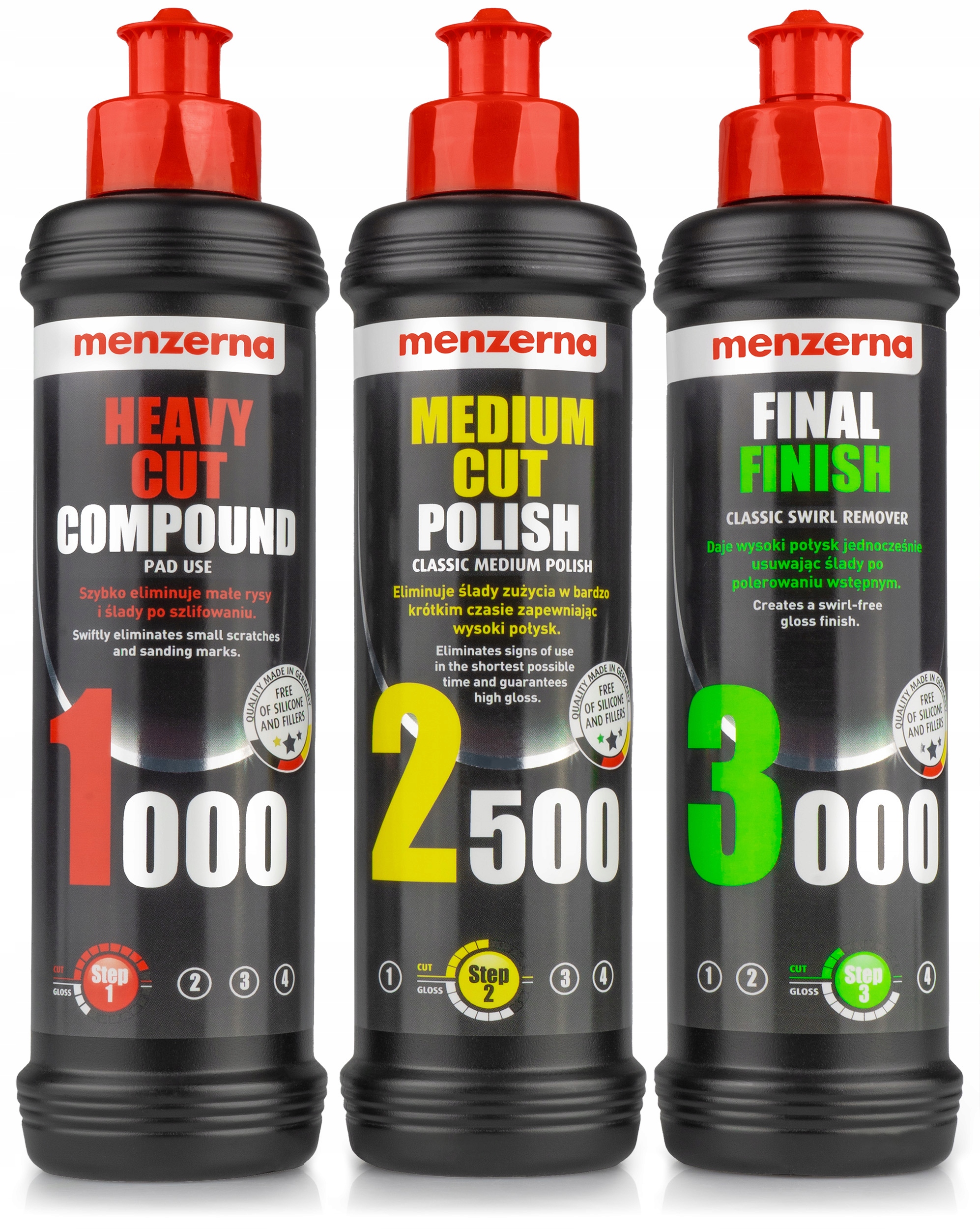 <р>1. MENZERNA Heavy Cut Compound 1000 - средство для полировки дефектов лакокрасочного покрытия 250 мл <р>2. MENZERNA Medium Cut Polish 2500 - абразивная полировальная паста 250 мл <р>3. MENZERNA Final Finish 3000 - финишная паста, полирующая так называемая зеркало⚙️ Полный контроль благодаря плавной регулировке скорости