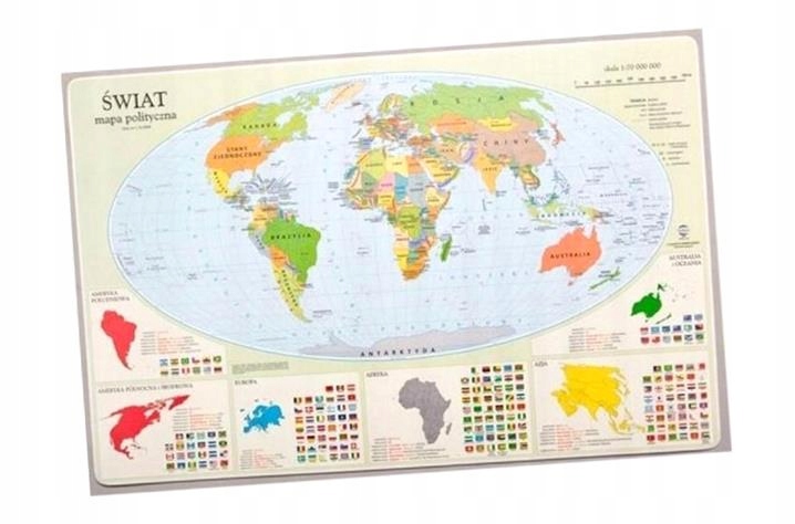 Отпечаток с текущим политическим разделением мира, карта содержит отдельные континенты с указанием их стран, флаги и столицы стран, площадь в км и самую важную информацию о данном континенте. Подушечка защищена высококачественной фольгой с противоскользящей подложкой, устойчивой к истиранию, пыли, воде и влаге. Его можно использовать как настольный коврик, коврик для компьютерной мыши, коврик для ноутбука и т. д.