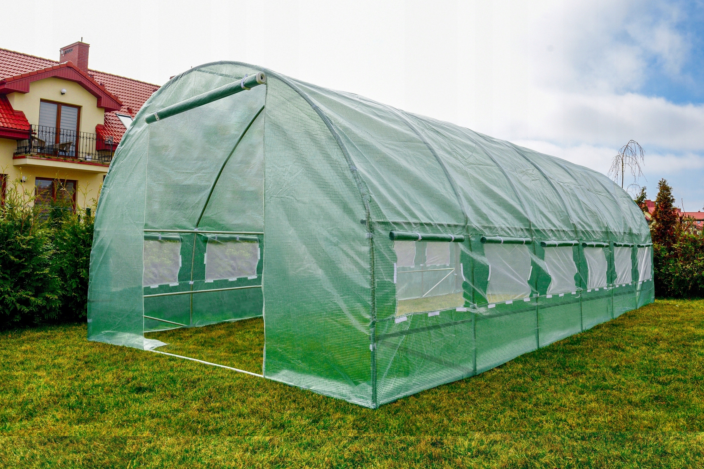 - 8 окон обеспечивают хорошую циркуляцию воздуха внутри пленки. Заполненные москитной сеткой отверстия защищают от проникновения насекомых и птиц.