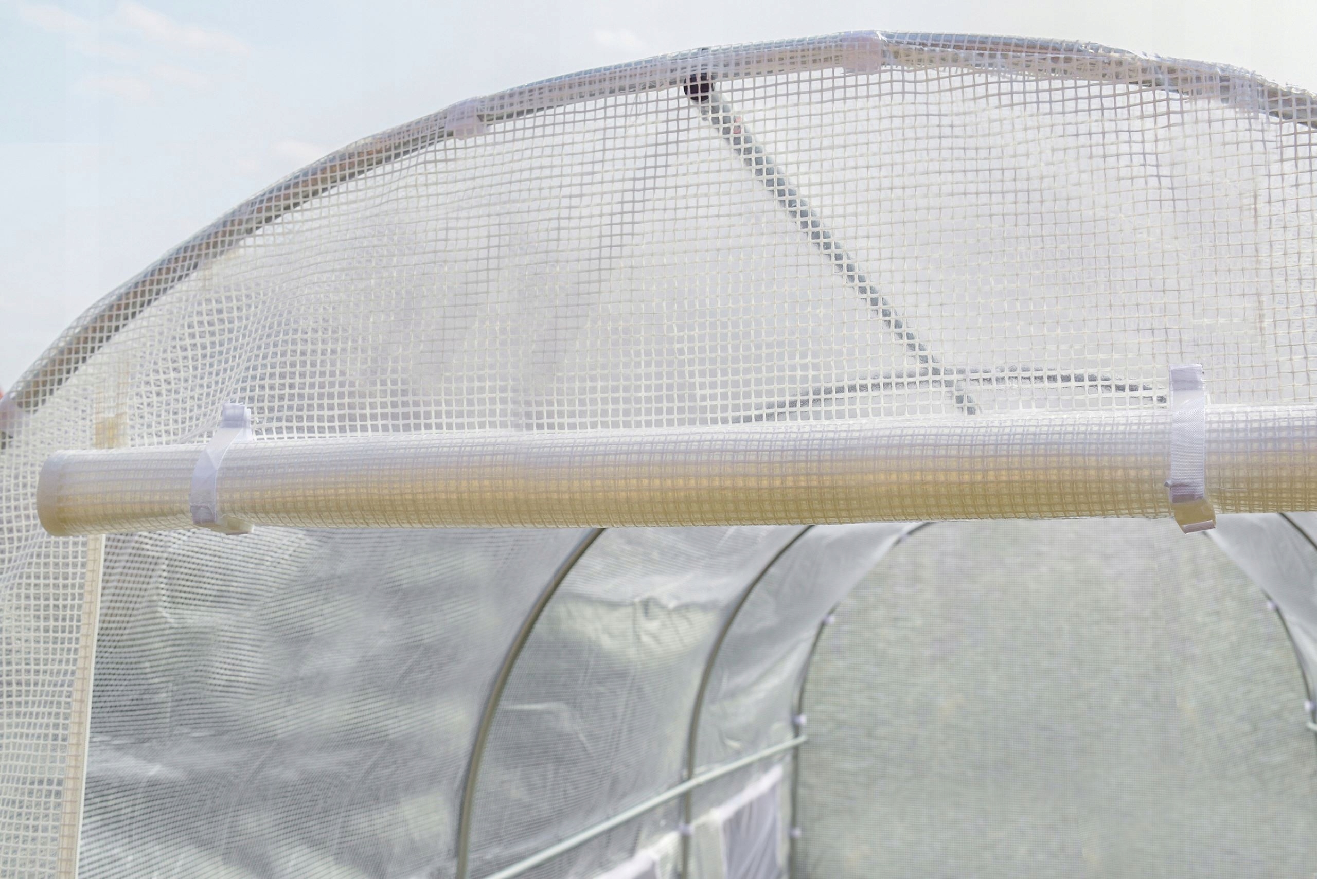 Покрытие туннеля из полиэтиленовой пленки с UV=4 > благодаря чему посевы будут иметь соответствующий микроклимат и одновременно выполнять изолирующую функцию. В боковых стенах имеются окна с москитными сетками, благодаря которым можно контролировать температуру и циркуляцию воздуха и в то же время защитить от насекомых >. Каждая стена расширена, образуя специальный фартук, который можно засыпать песком, чтобы избежать взрыва. Благодаря встроенной полипропиленовой сетке пленка устойчива к повреждениям и разрывам.