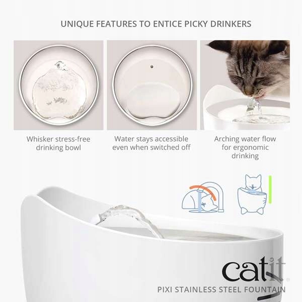 Автоматическая поилка-фонтанчик для кошек Catit PIXI 2,5л + бесплатный фильтр эффективно побуждает кошку пить, обеспечивая ей постоянный доступ к воде отличного качества.