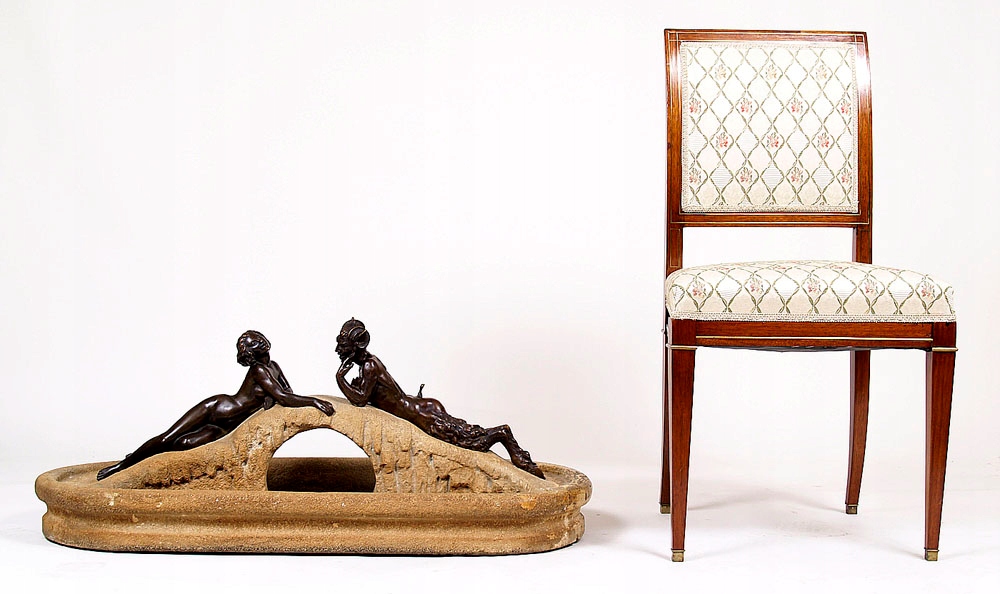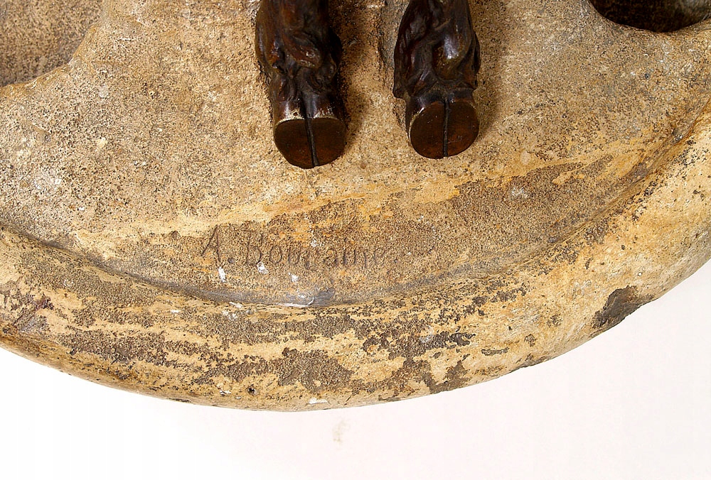 Песчаник, патинированная бронза, на камне подпись «А.Бурен», цифры «5», выбитые на бронзе как на копытах Сатира, так и на правая нога нимфы. Примерно: 1930 год.