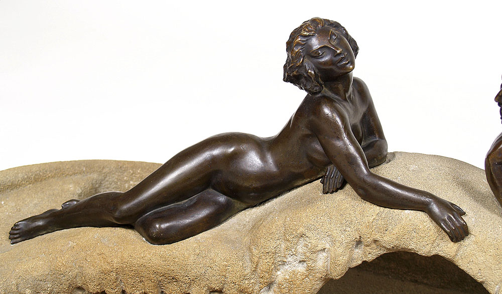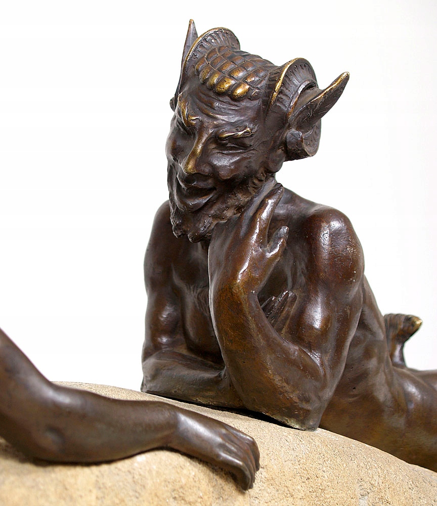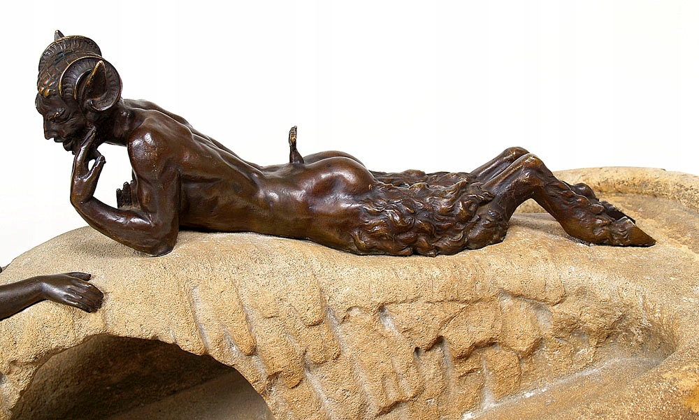 на овальном постаменте из песчаника, с небольшим мостиком посередине, по краям которого расположены две бронзовые фигуры в полный рост. установлен. На них изображена лежащая, улыбающаяся, обнаженная нимфа, с поднятой вверх и поддерживаемой левой рукой головой, а перед ней, также лежащий, Сатир. Выражение его губ указывает на разговор с нимфой.