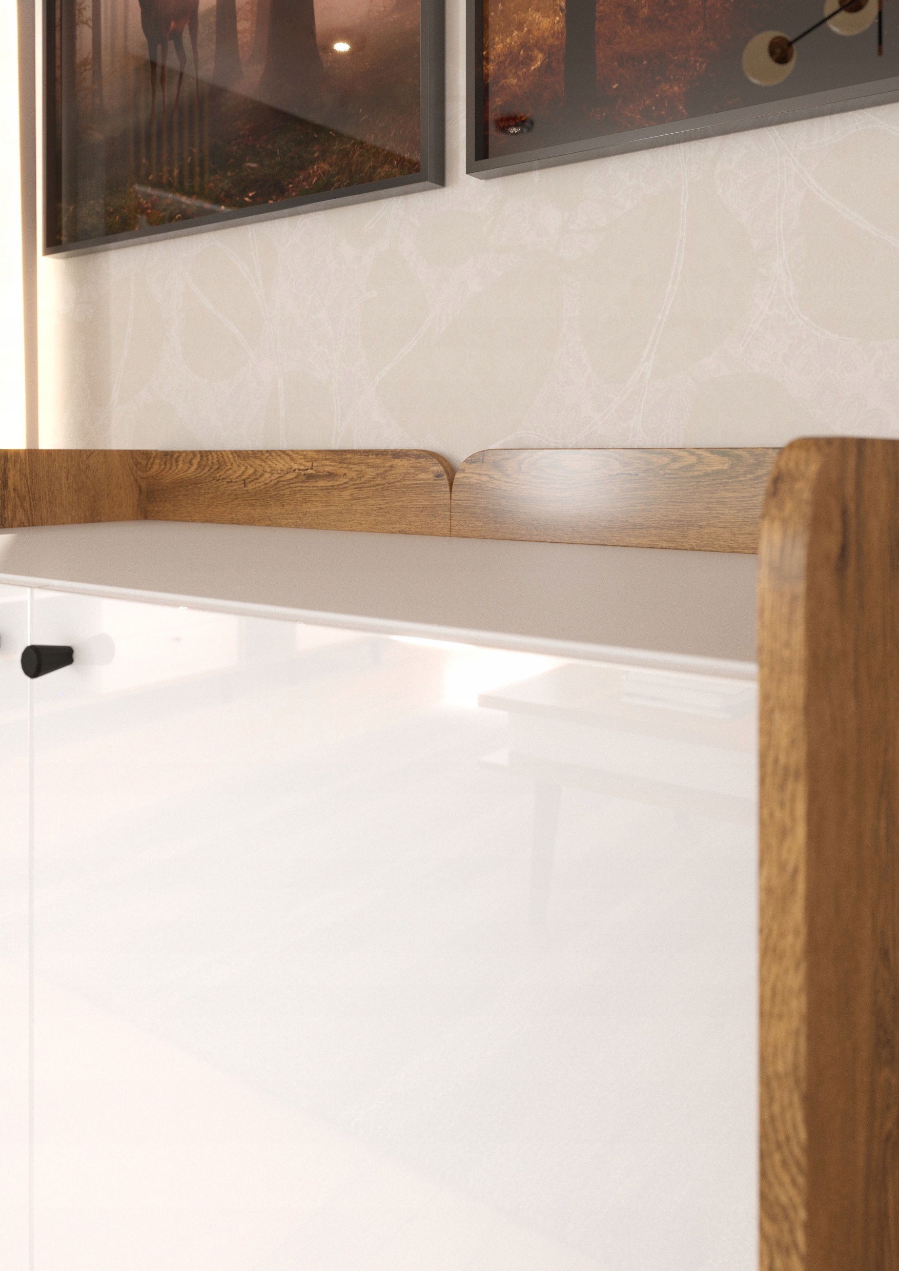 Коллекция DOLCE – идеальное решение для гостиной или спальни. Мебель придаст современный вид всей обстановке, а ее простая и оригинальная форма впишется во многие интерьеры. Серия DOLCE имеет минималистичные ручки, соответствующие цвету ножек. Цвет дуба в сочетании с белыми глянцевыми фасадами создает единое целое, которое, несомненно, привлекает внимание. Мебель очень просторная и функциональная. Коллекция оснащена бесшумной системой закрывания, тарелки защищены кромкой ABS.