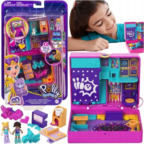 Компактный набор Polly Pocket Игровая гостиная HCG15. Откройте для себя забавное повествование и играйте в него, прикрепив одну из кукол к танцевальной игре, чтобы танцевать, собрать боулинг для игры, прикрепить картинг и мотоцикл к трассе и участвовать в гонках, стрелять в корзины во время игры в баскетбол и повернуть экран телевизора на 3. различные игры.