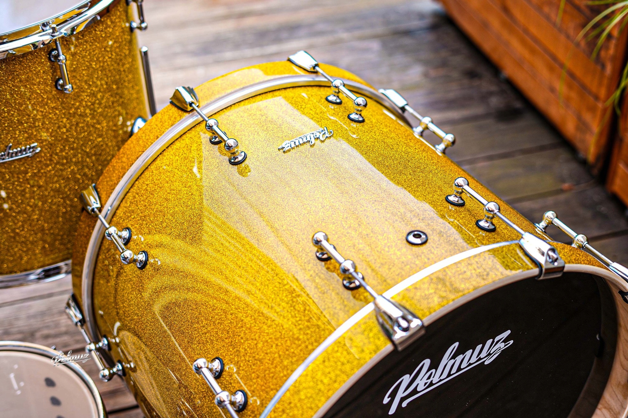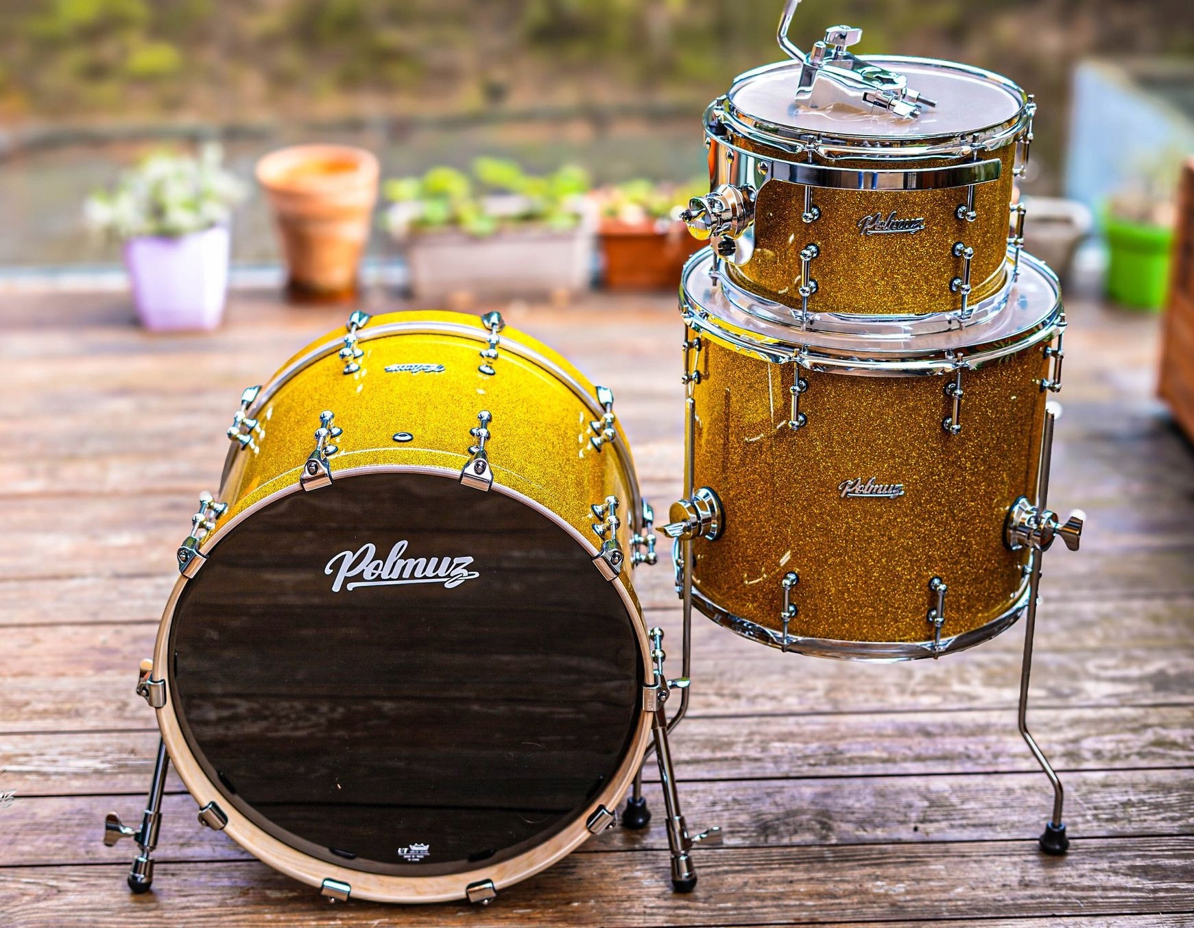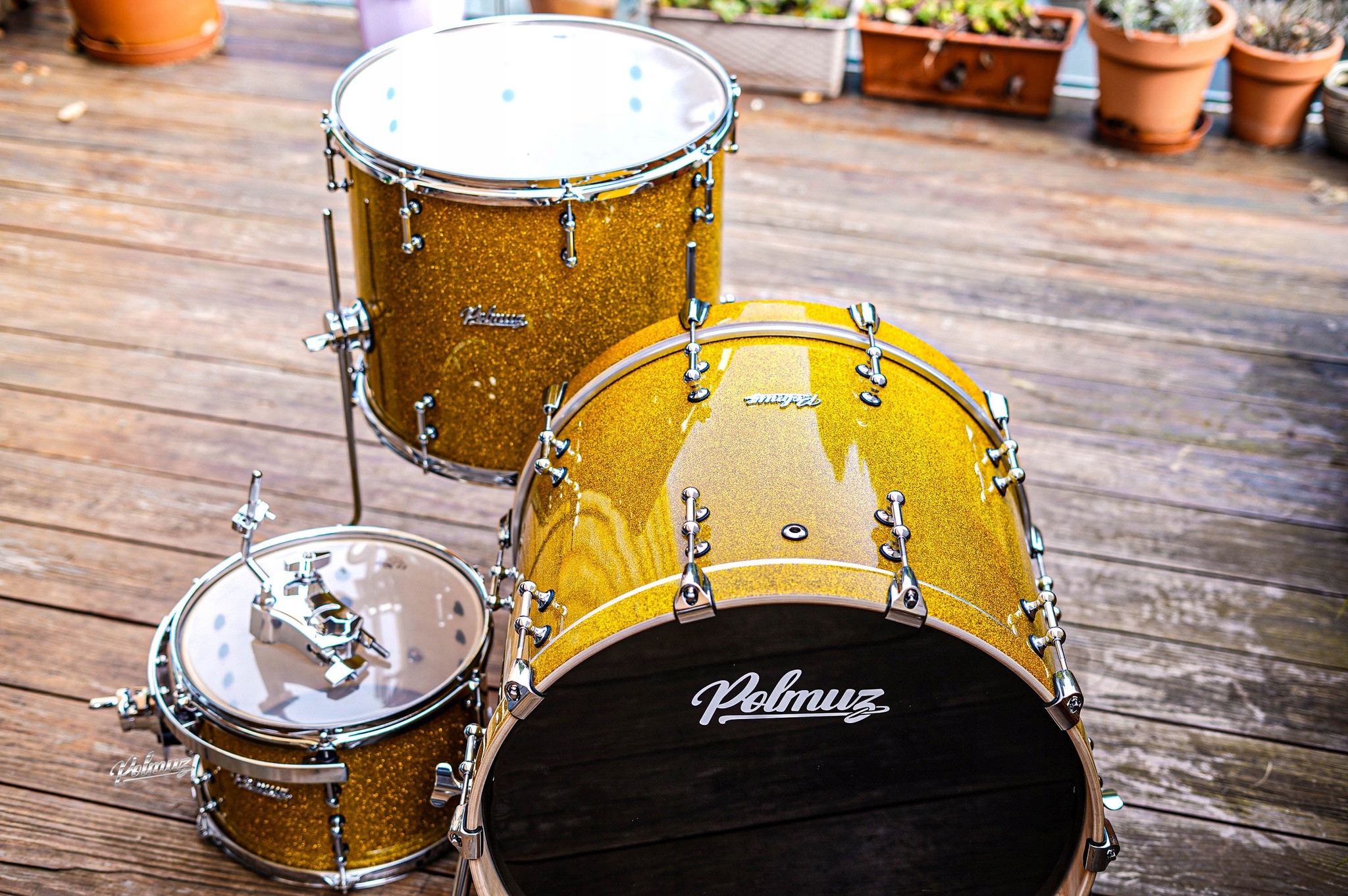 Оклоненная отделка придает каждому набору уникальный вид. Лак, используемый для завершения клена модели 2 барабанов из Polmuz, является самым высоким качеством. Безумный золотой блеск с толстыми зернами будет восхищать многих. Композиция и метод применения лака соответствуют тем, которые используются в лучших наборах признанных брендов.