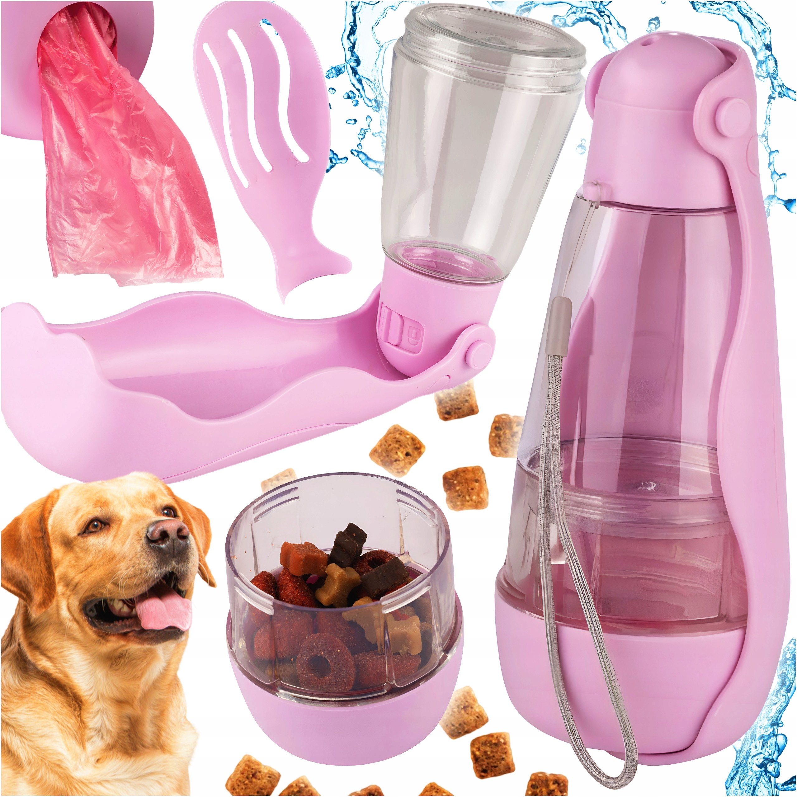 Многофункциональная бутылочка для собак 5 в 1 с поилкой и лопаточкой, розовая