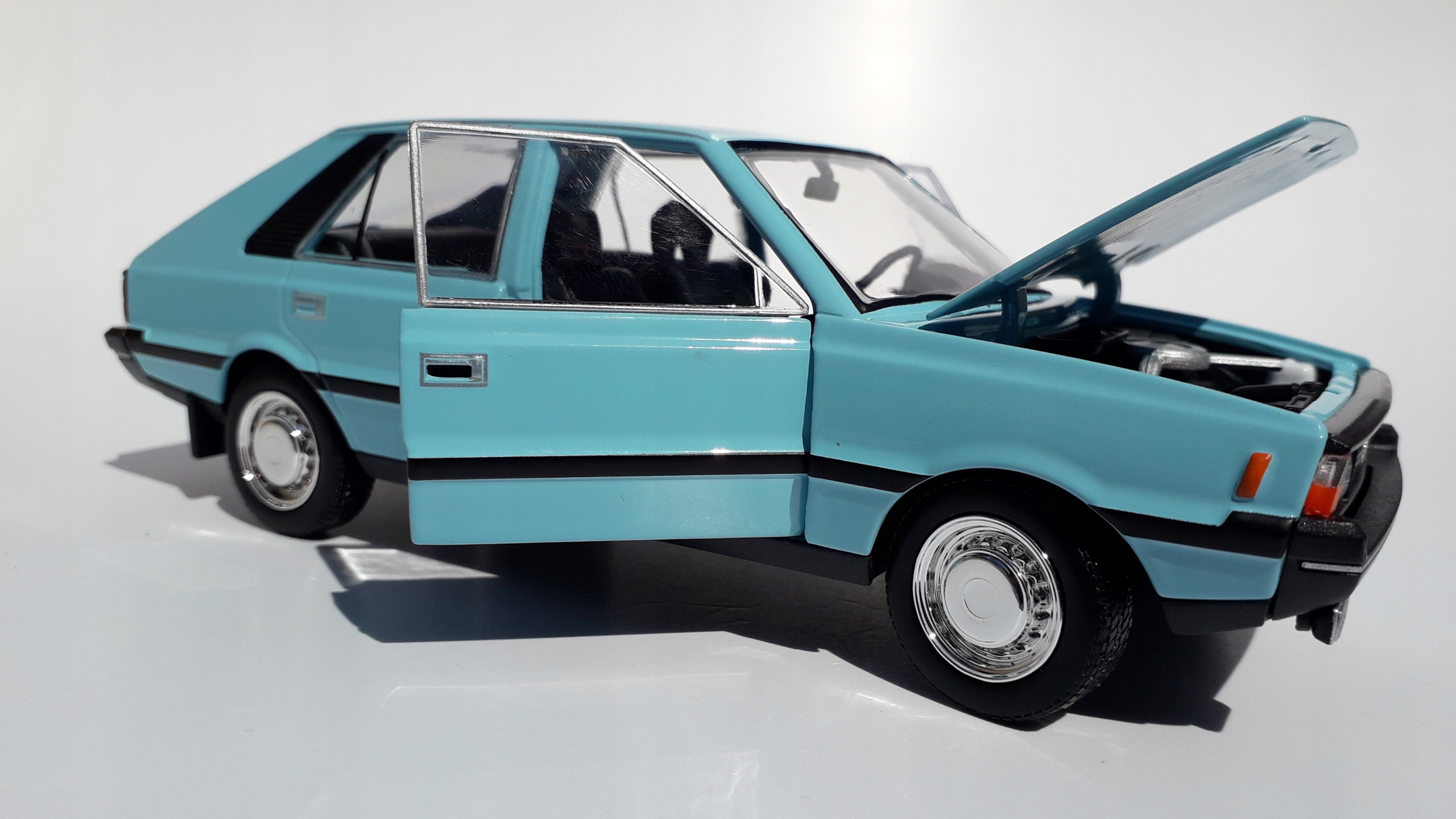 Металлический автомобильный корпус, покрытый вагоном лаком. Открыл входную дверь и маску. Двадцать передних колес. Резиновые шины. Пластиковый центр.