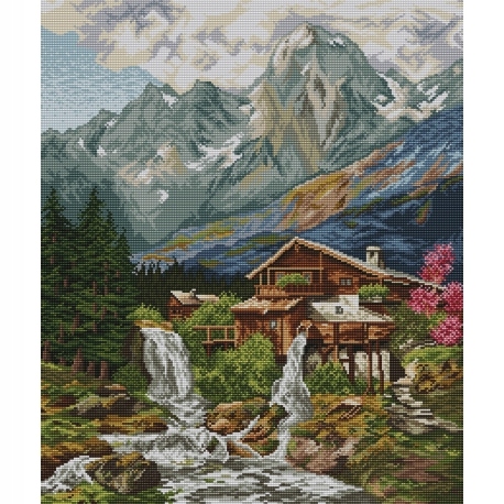 Красивый горный пейзаж для вышивки крестом с деревянным особняком посреди леса в высоких, чрезвычайно живописных горах. Коттедж расположен рядом с двумя удивительными водопадами, впадающими в быструю чистую реку. Канва создает замечательную композицию для самостоятельной вышивки.