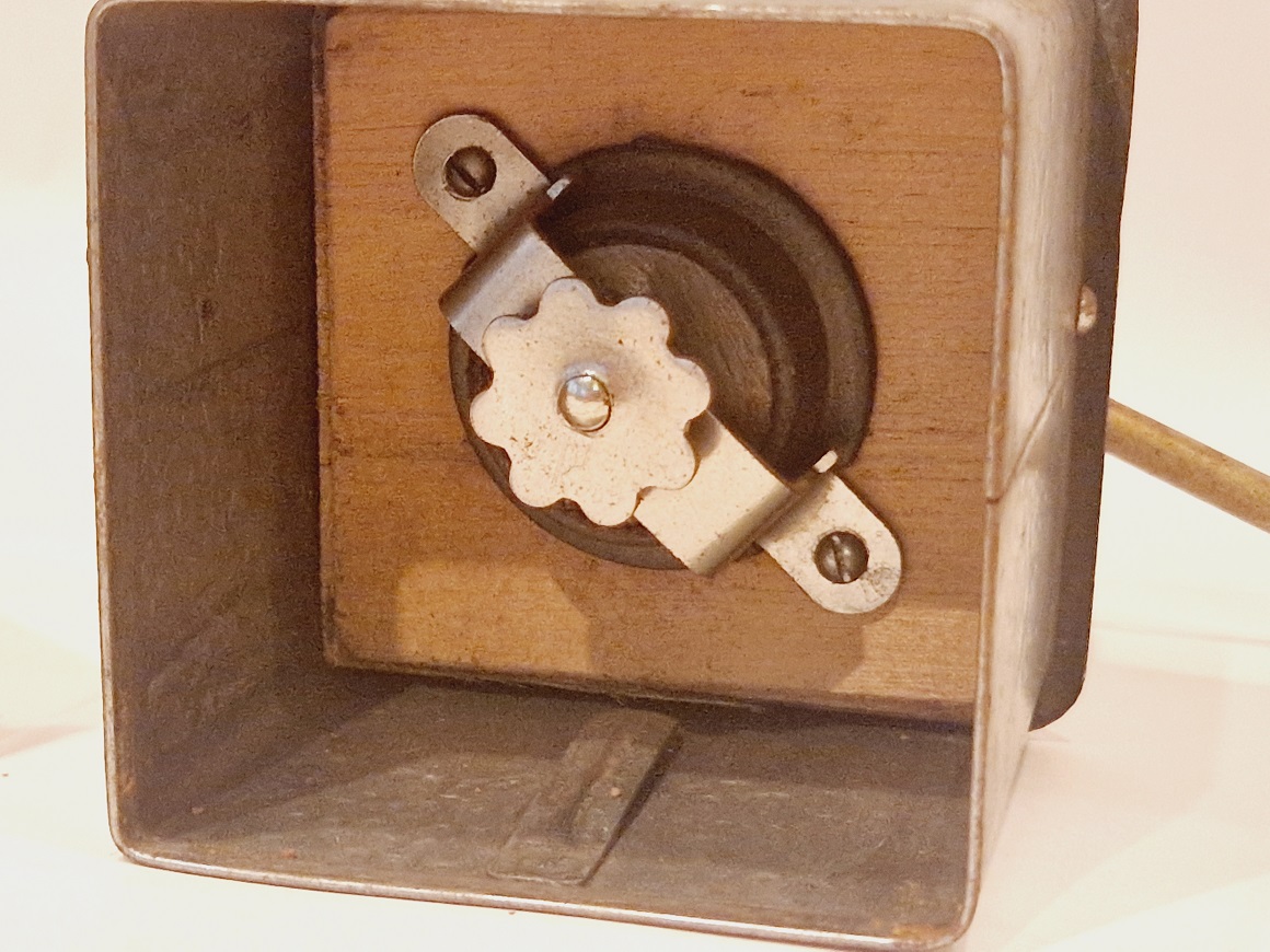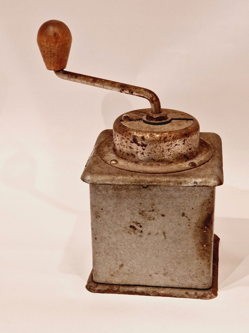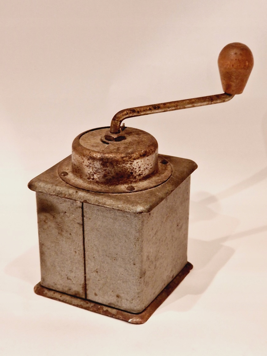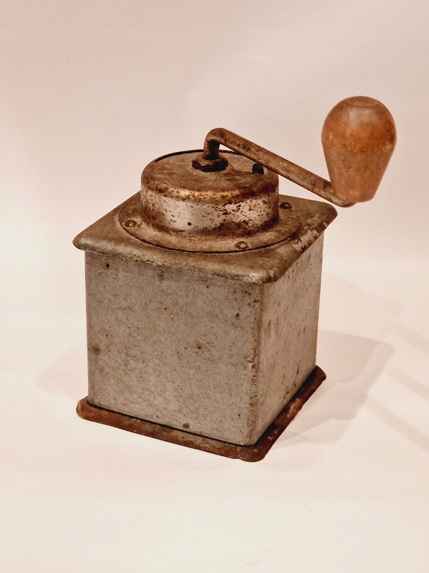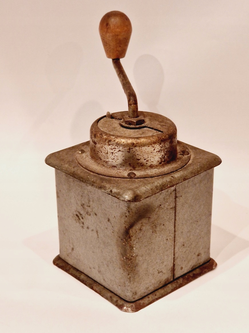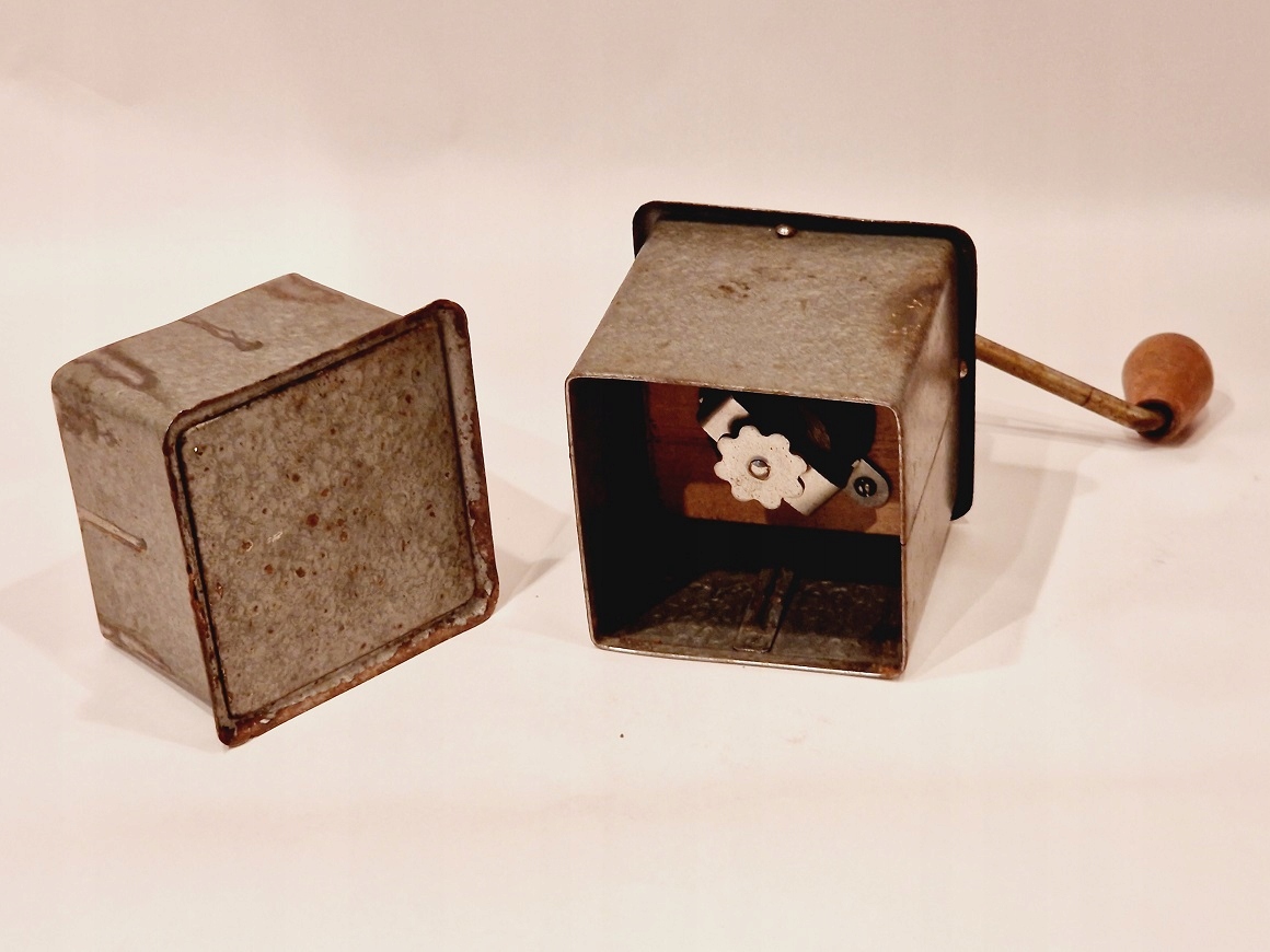 Форма ящика такая же, как и основание кофемолки - оригинальная металлическая банка.