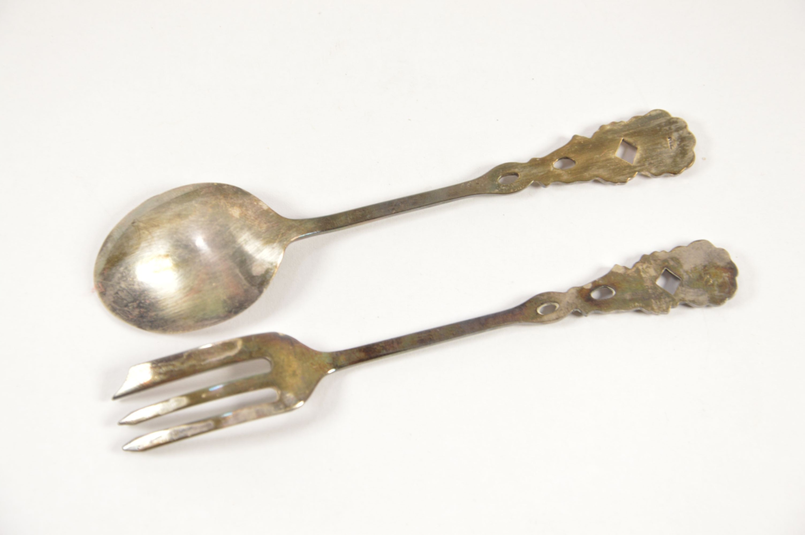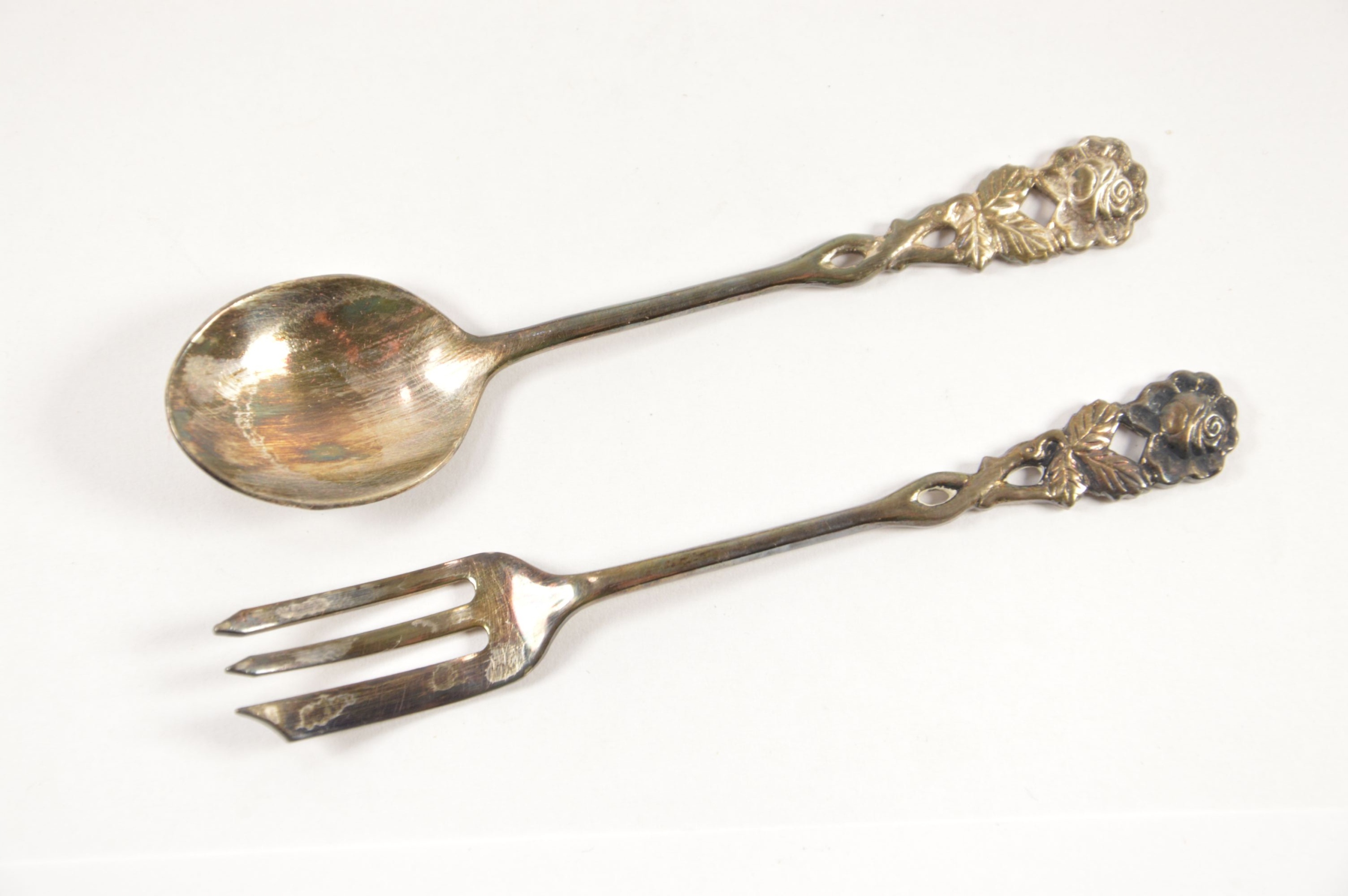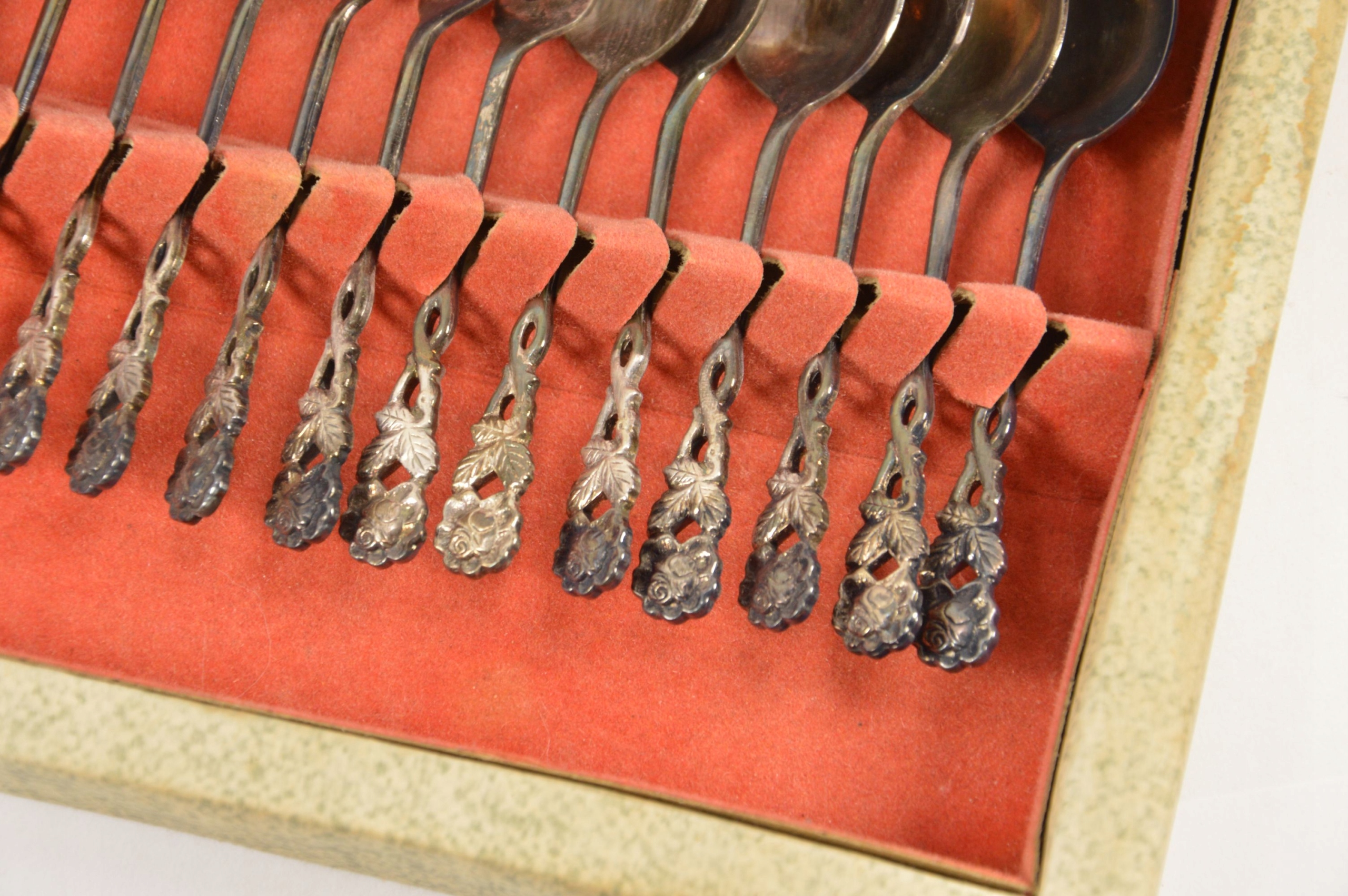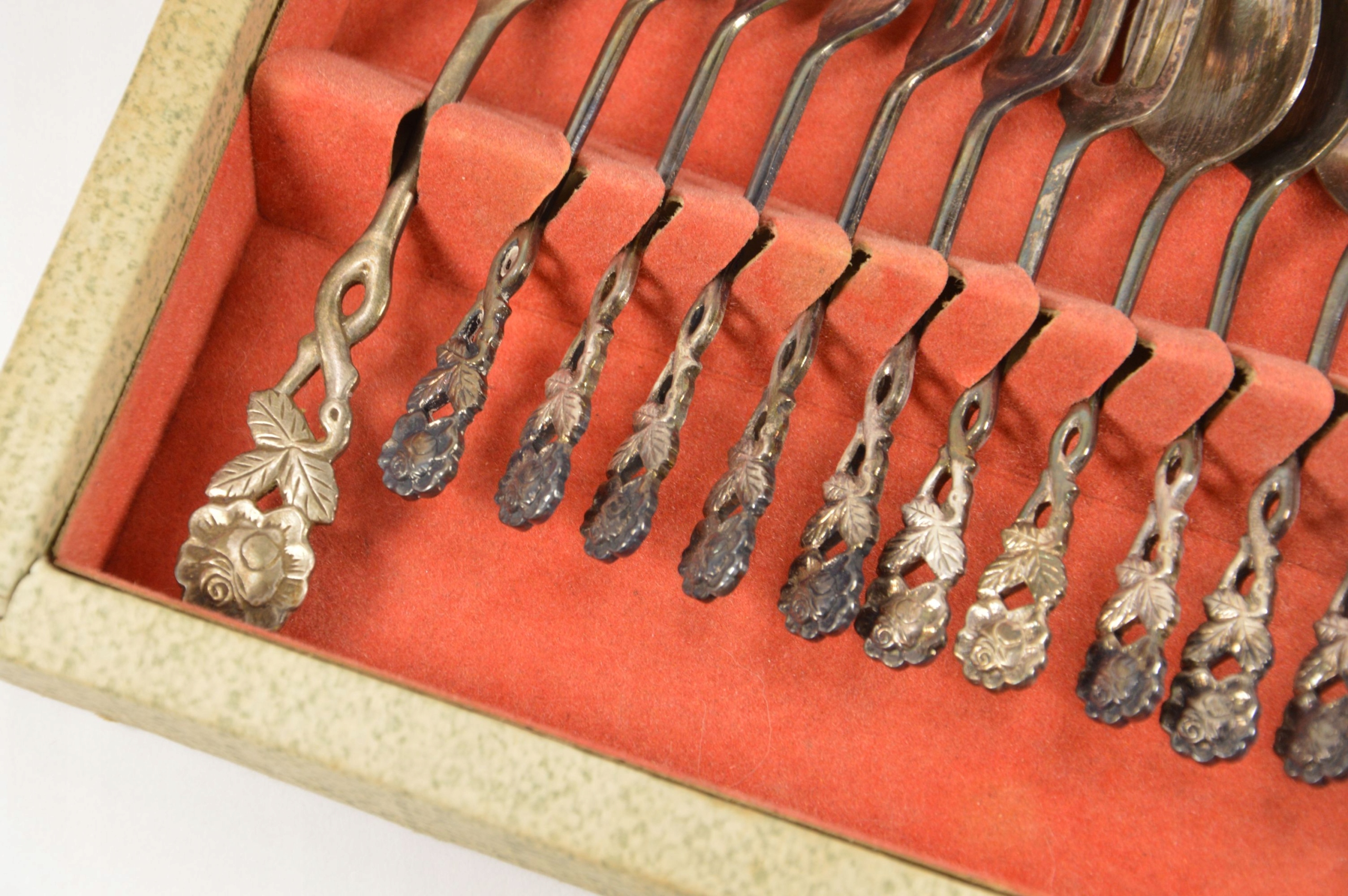 Набор красиво декорированных столовых приборов для кофе и торта. В набор входят шесть чайных ложек, шесть вилок и ложка для сахара. Все это украшено мотивом розы и поставляется в оригинальном футляре. Столовые приборы очень хорошо сохранились, покрыты натуральной патиной.
