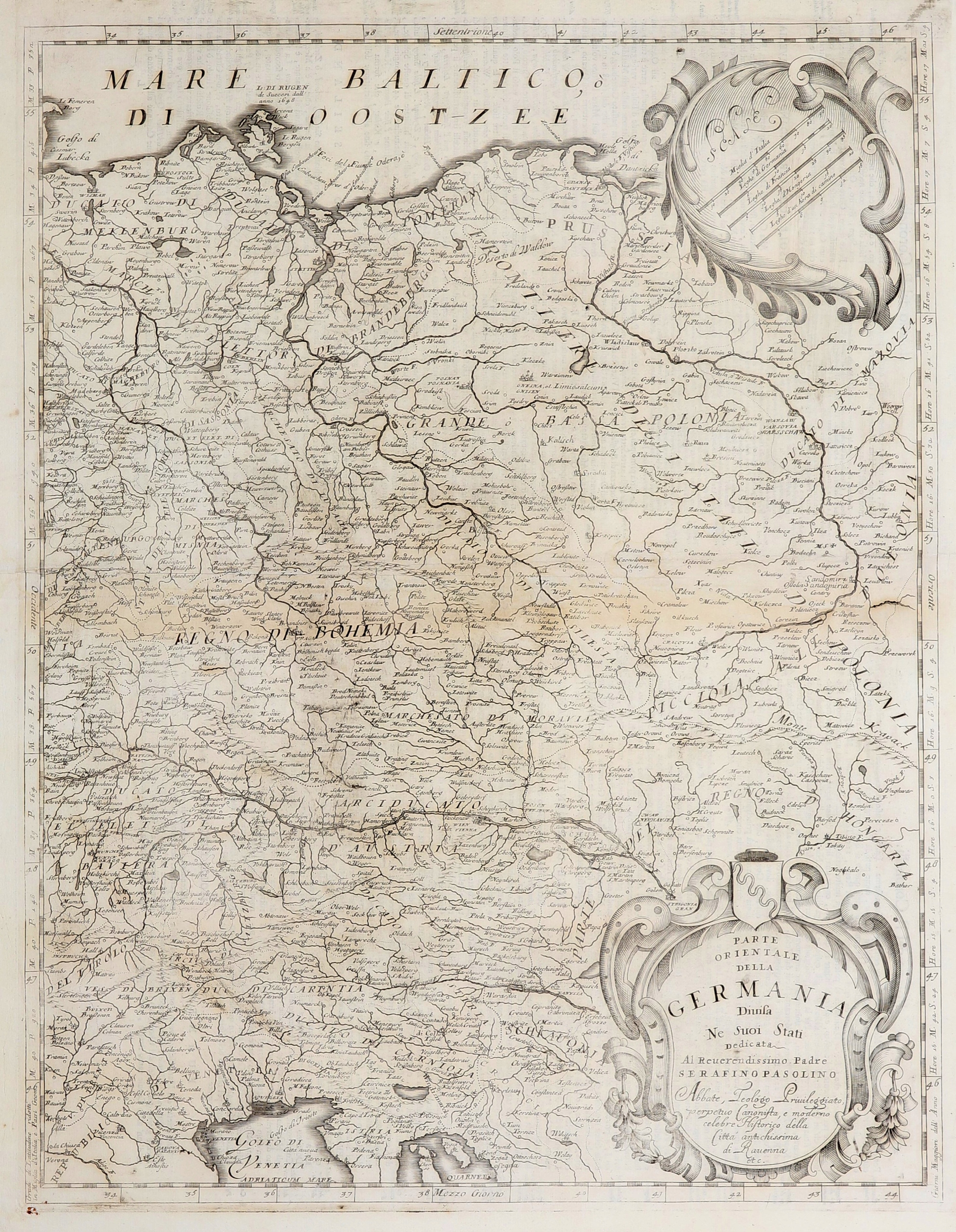 ПОЛЬША (в Первой Польской республике называлась КОРОНОЙ), ГЕРМАНИЯ. Карта западной части польских земель и восточной части немецких земель — один из листов двухчастной карты Германии; подготовлен В. Коронелли, 1697 г.; посвящение аббату Серафино Пазолино, автору произведения, описывающего историю Равенны; на оборотной стороне текст на английском итальянском языке; медь. Ч/Б, очень хорошее качество, минимальные потери бумаги, паспарту; доски произношения 460х600 мм; PARTE ORIENTALE DELLA GERMANIA Diuisa Ne Suoi Stati [...]; ОЧЕНЬ РЕДКОСТЬ!