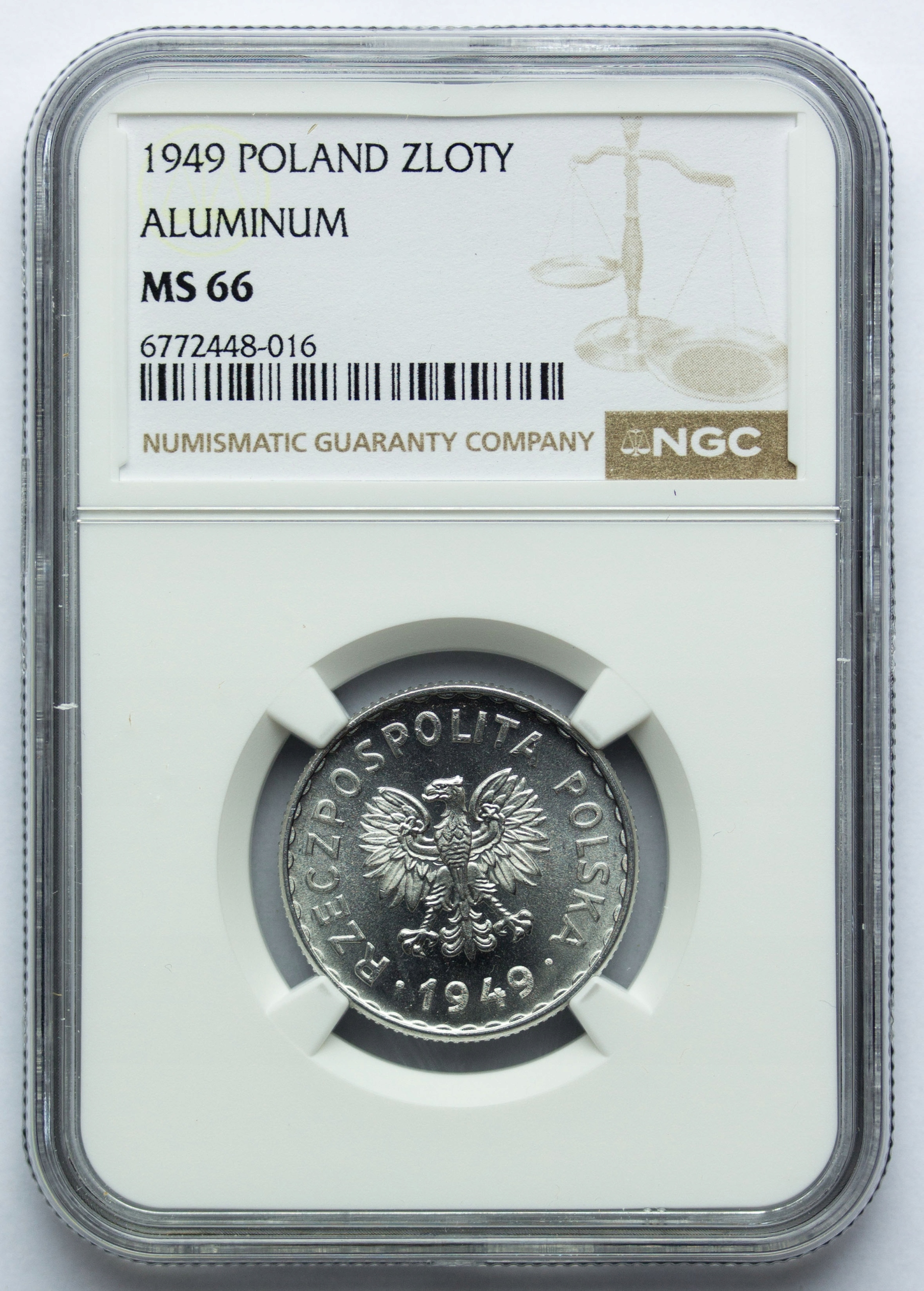 Польша, PRL, 1 Zloty 1949, алюминий, NGC MS66, 2 -я нота, Beautiful