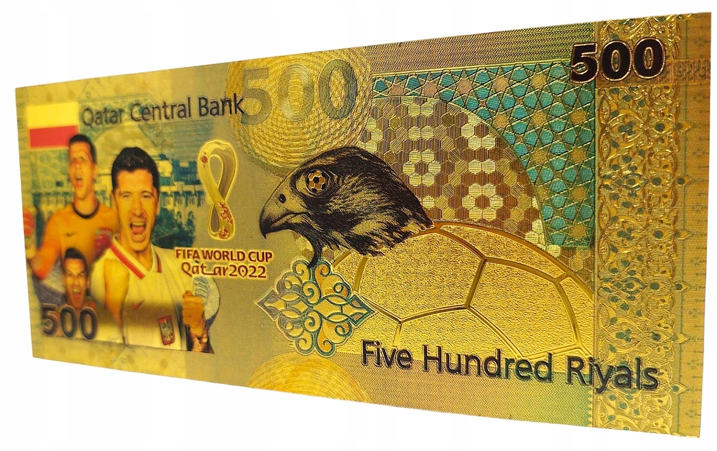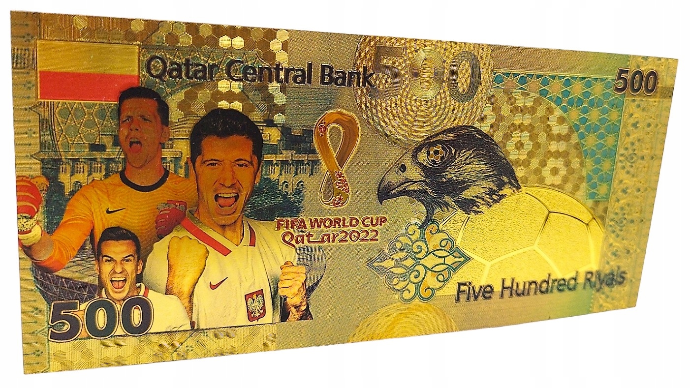 Красивая позолоченная банкнота номиналом 500 риалов с изображением сборной Польши.